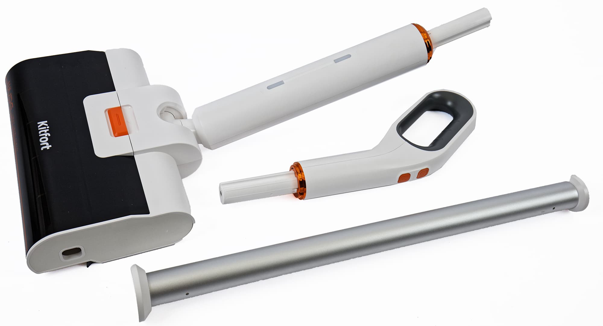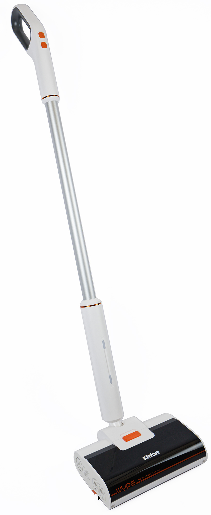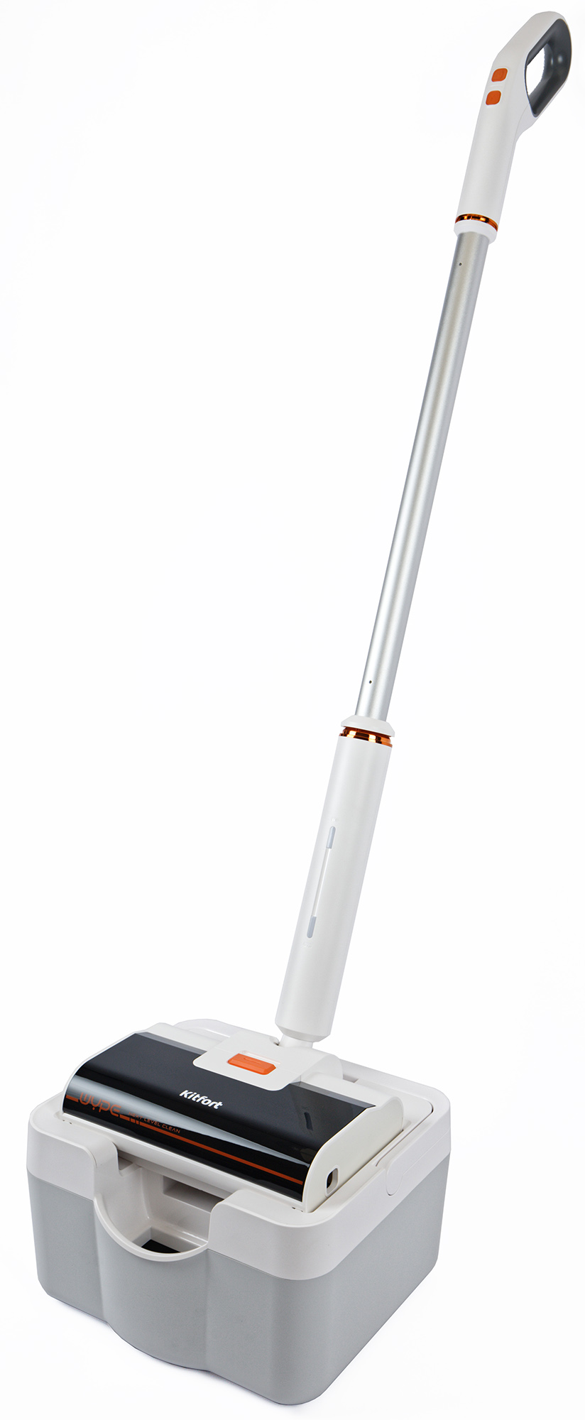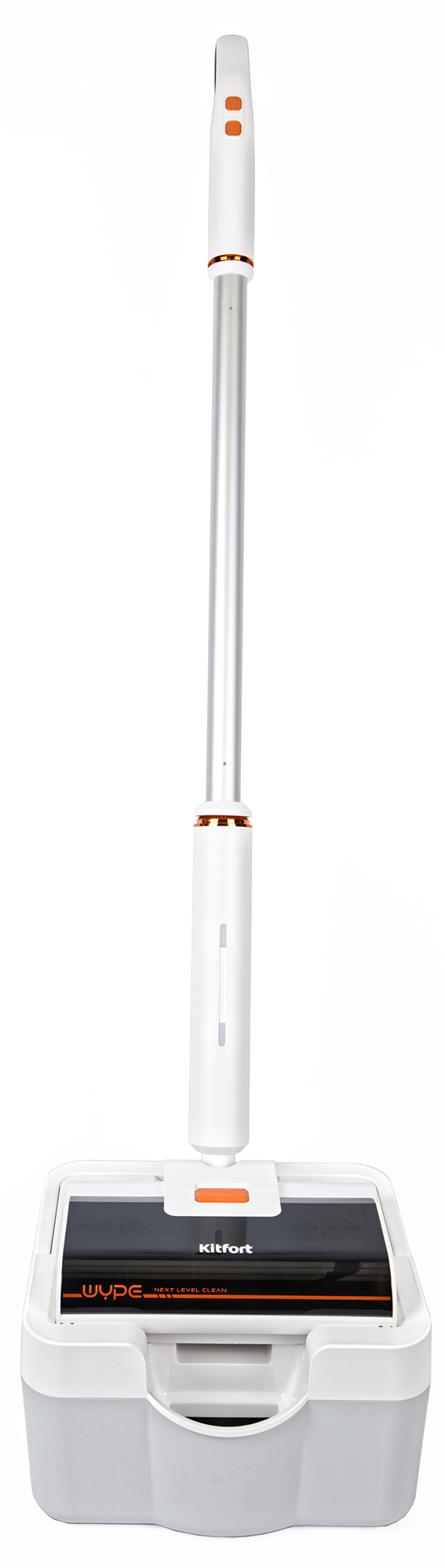 Корпус беспроводной электрошвабры и изготовлен из гладкого пластика белого цвета с серыми и черными вставками. Конструкцию можно разделить на три элемента: корпус с резервуаром для воды, напольную щетку и удлинительную трубку с рукояткой. Лаконичный ненавязчивый дизайн КТ-599 выглядит симпатично и аккуратно. Все детали плотно подогнаны и создают впечатление качественно собранного устройства.