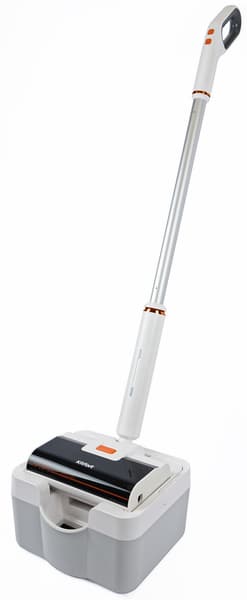 Шарнирное крепление напольной щетки к основному блоку позволяет легко проникать в труднодоступные места. Вес устройства при работе не ощущается вовсе, так как швабра сама едет вперед и нужно лишь слегка направлять ее в нужную сторону. Если отпустить ручку, она даже способна проехать по прямой без посторонней помощи до первого препятствия.