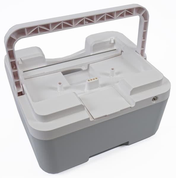 База электрошвабры представляет собой пластиковый бак с удобной ручкой для переноски в верхней части конструкции. Также наверху находится перекладина для отжима валика и отсек для слива грязной воды, внутрь которого устанавливается решетчатая корзина для крупного мусора. Рядом с ним — электрические контакты для зарядки.
