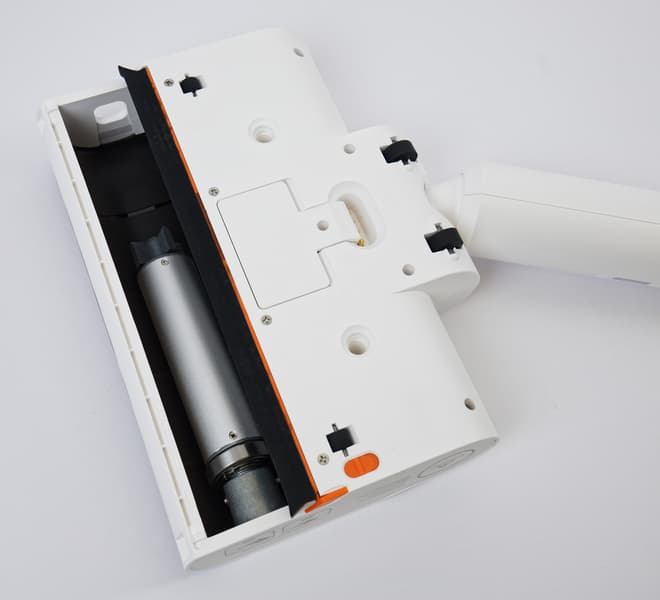 Первый, верхний, сообщает о состоянии зарядки электрошвабры. Если в процессе уборки индикатор загорелся оранжевым светом — пора заряжать аккумулятор. В процессе зарядки, верхний индикатор горит оранжевым непрерывно, когда аккумулятор полностью заряжен — свет меняется на белый. Нижний индикатор горит только оранжевым, и лишь в одном случае, если пора заменить валик. На корпусе базы также имеется индикатор отсутствия чистой воды. Если вода в баке закончилась, он загорается оранжевым.