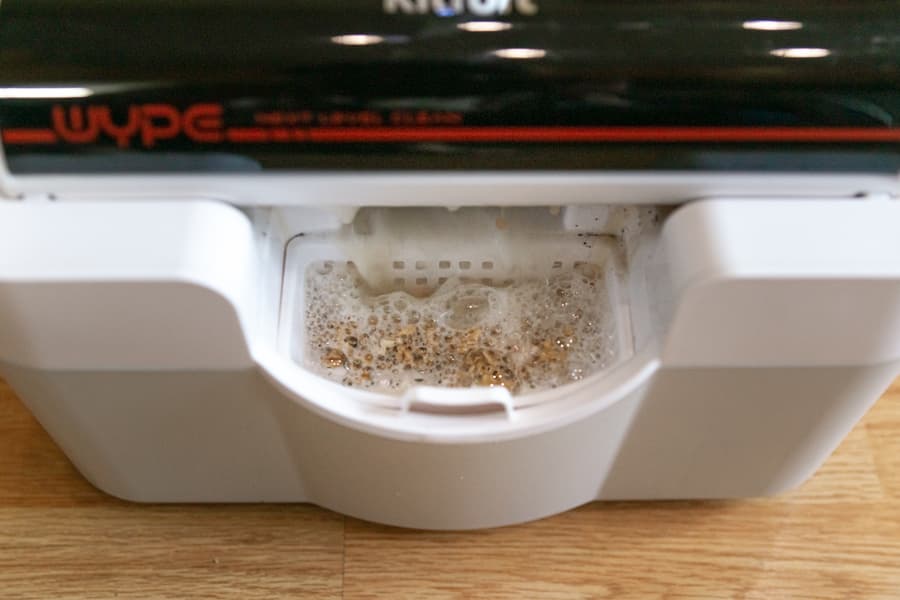 Установив базу на ровную сухую поверхность вблизи розетки, внутрь слива для грязной воды помещается корзина для крупного мусора. Далее открываем крышку резервуара для чистой воды и заливаем примерно 3 литра; в этот момент можно добавить мягкое моющее средство. Отметки максимального уровня воды в баке нет, поэтому следим чтобы вода не доходила до краев примерно на 5 мм. При каждом полном цикле самоочистки расходуется около 1 л воды. При запуске автоочистки база подаёт чистую воду мощными струями в отсек для мусора напольной щетки. Валик обливается водой и отжимается для того, чтобы смыть впитавшиеся загрязнения, а турбощетка очищает валик и свой ворс. Полного бака хватает на 3 промывки валика. При несильных загрязнениях поверхности пола, одного бака, с запуском 3 промывок нам хватило на уборку 30 м².