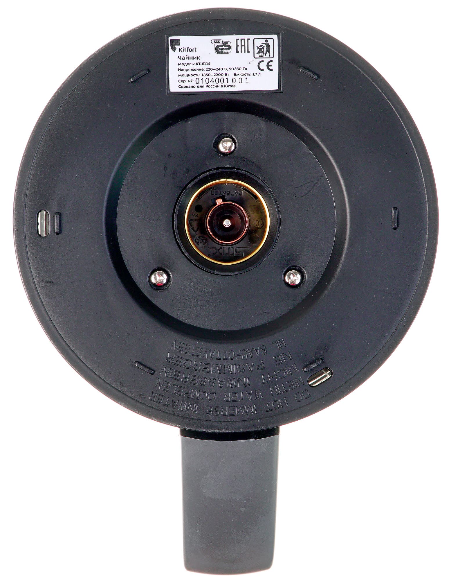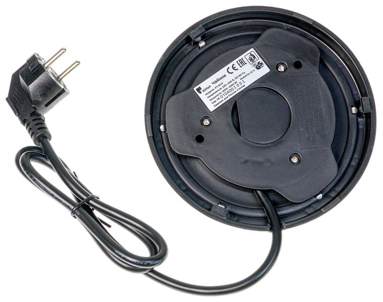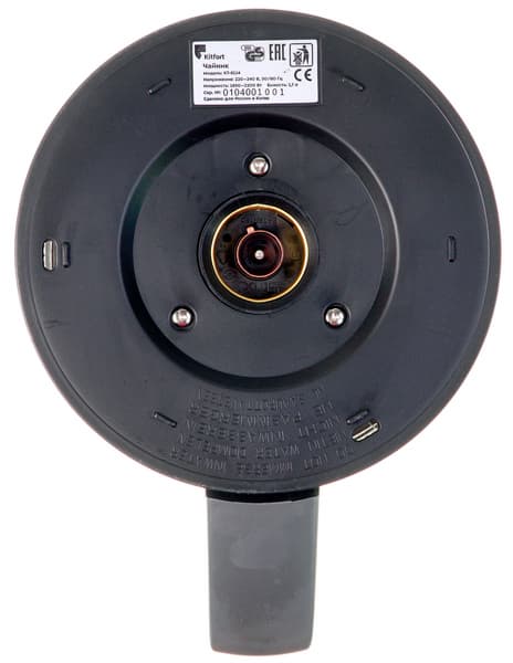 На нижней стороне чайника можно увидеть круглую контактную группу, позволяющую свободно вращать чайник на базе. Можео также разглядеть, что чайник оснащён контроллером Strix.
