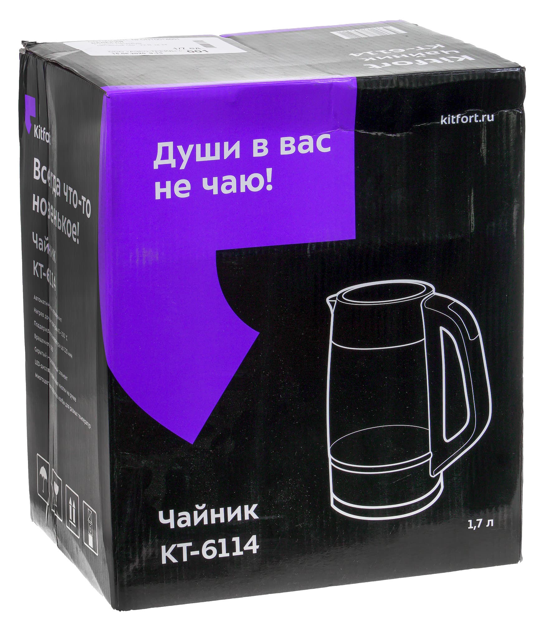 Чайник поставляется в коробке, оформленной в фирменной стилистике компании Kitfort. Коробка сделана из картона, содержимое защищено от ударов с помощью картонных вкладок и полиэтиленовых пакетов. Изучив коробку, можно увидеть векторное изображение прибора, а также ознакомиться с его основными техническими характеристиками.