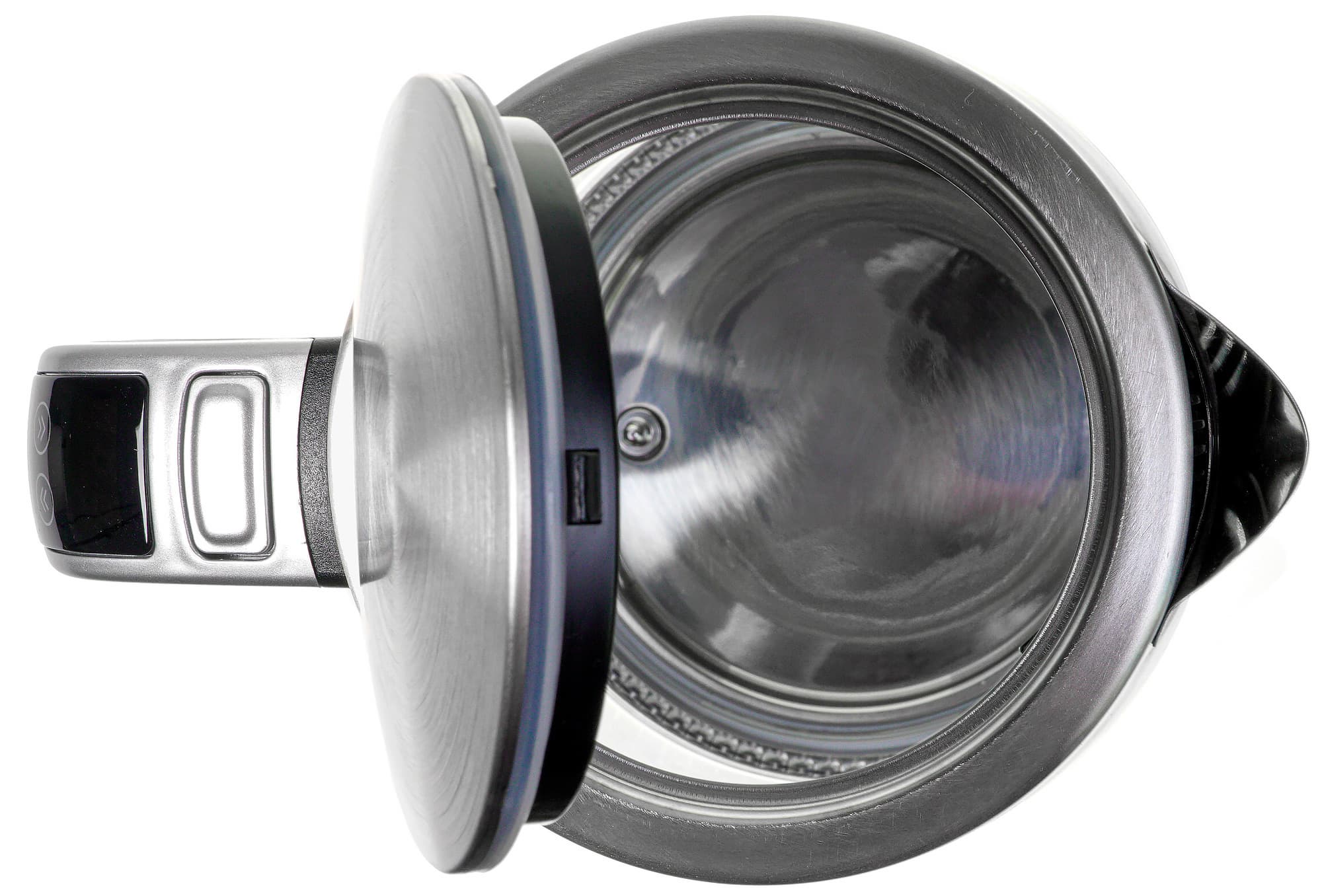 Крышка, как и корпус, выполнена из пластика (снизу) и нержавеющей стали (сверху). Открывается она с помощью кнопки, расположенной на ручке. Под кнопкой находится ЖК-дисплей и четыре сенсорных кнопки, с помощью которых осуществляется управление чайником. Сама ручка (в том числе зона захвата) сделана из пластика, местами окрашенного «под металл».
