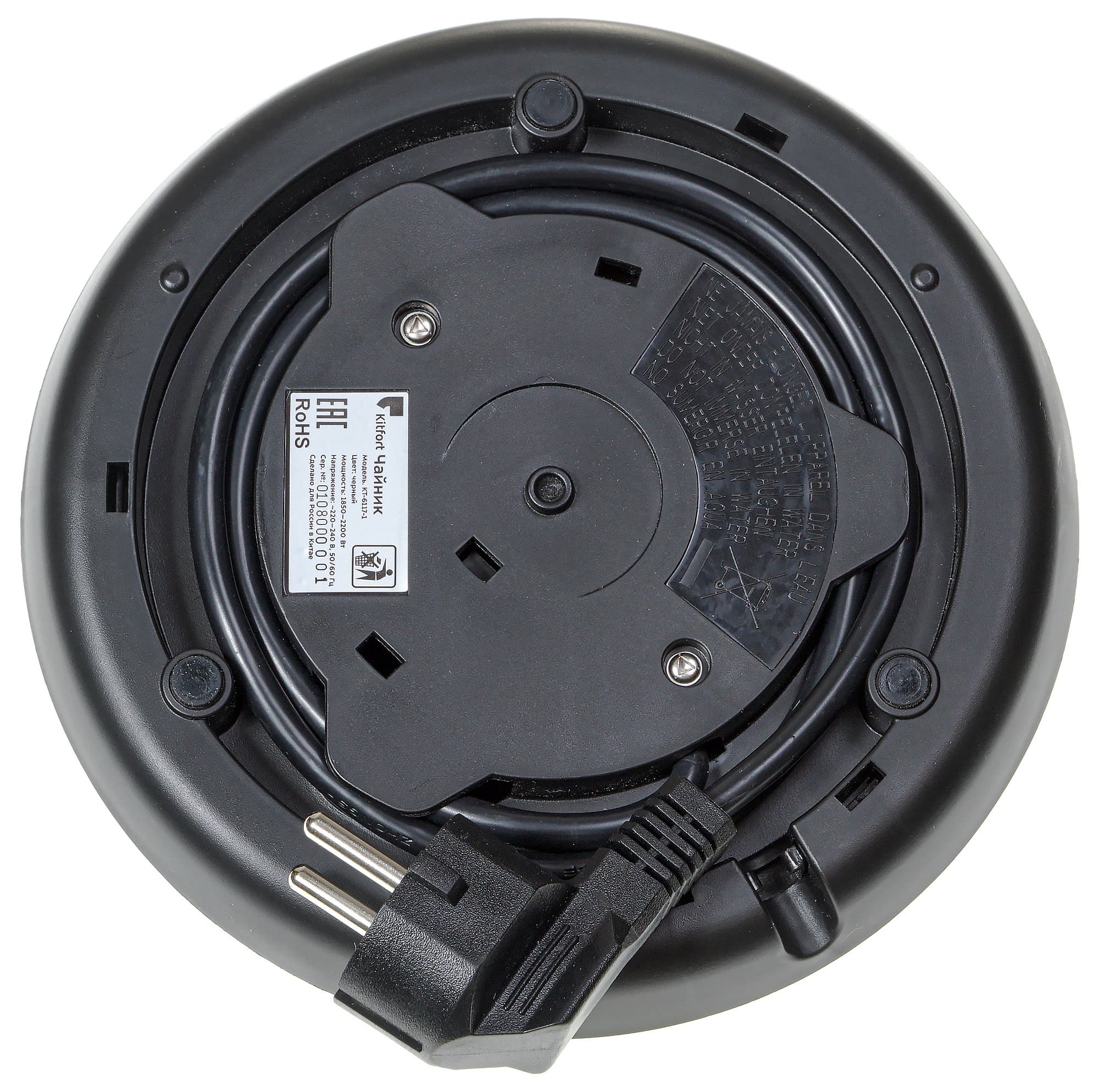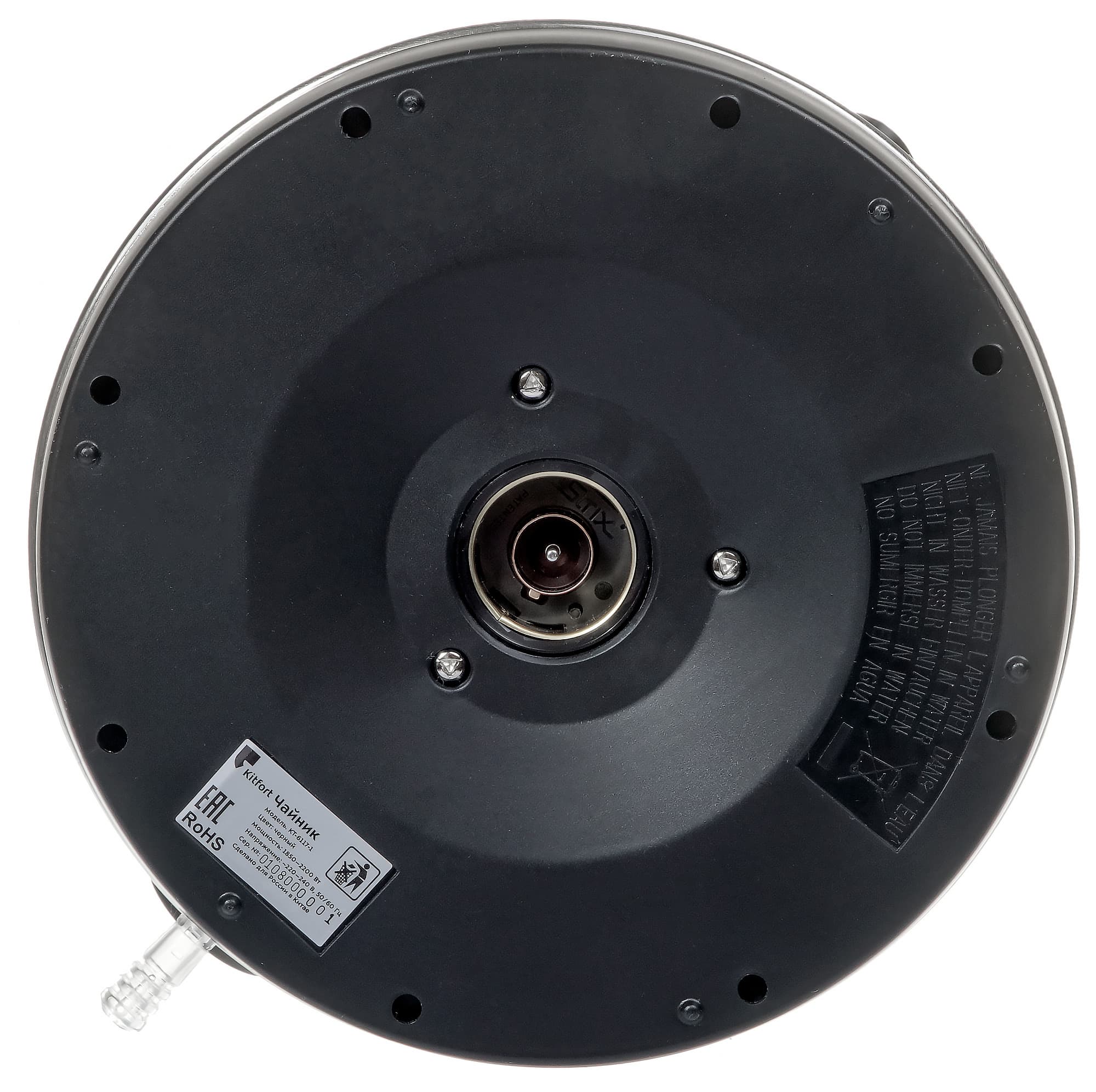 Нижняя часть корпуса у прибора — пластиковая. На одной из боковой стороне находится логотип Kitfort, сзади — рычаг включения, снизу — уже хорошо знакомая нам контактная группа Strix и информационная наклейка. Как водится, чайник можно свободно вращать на базе.