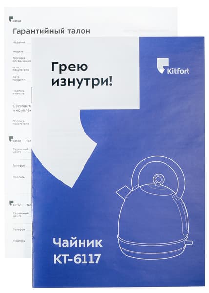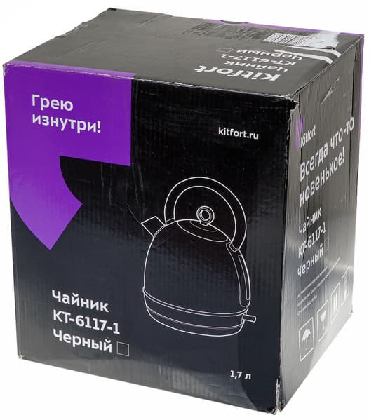 Чайник поставляется в коробке, оформленной в фирменной стилистике компании Kitfort. Коробка сделана из картона, содержимое защищено от ударов с помощью картонных вкладок и полиэтиленовых пакетов. Изучив коробку, можно увидеть векторное изображение прибора, а также ознакомиться с его основными техническими характеристиками.