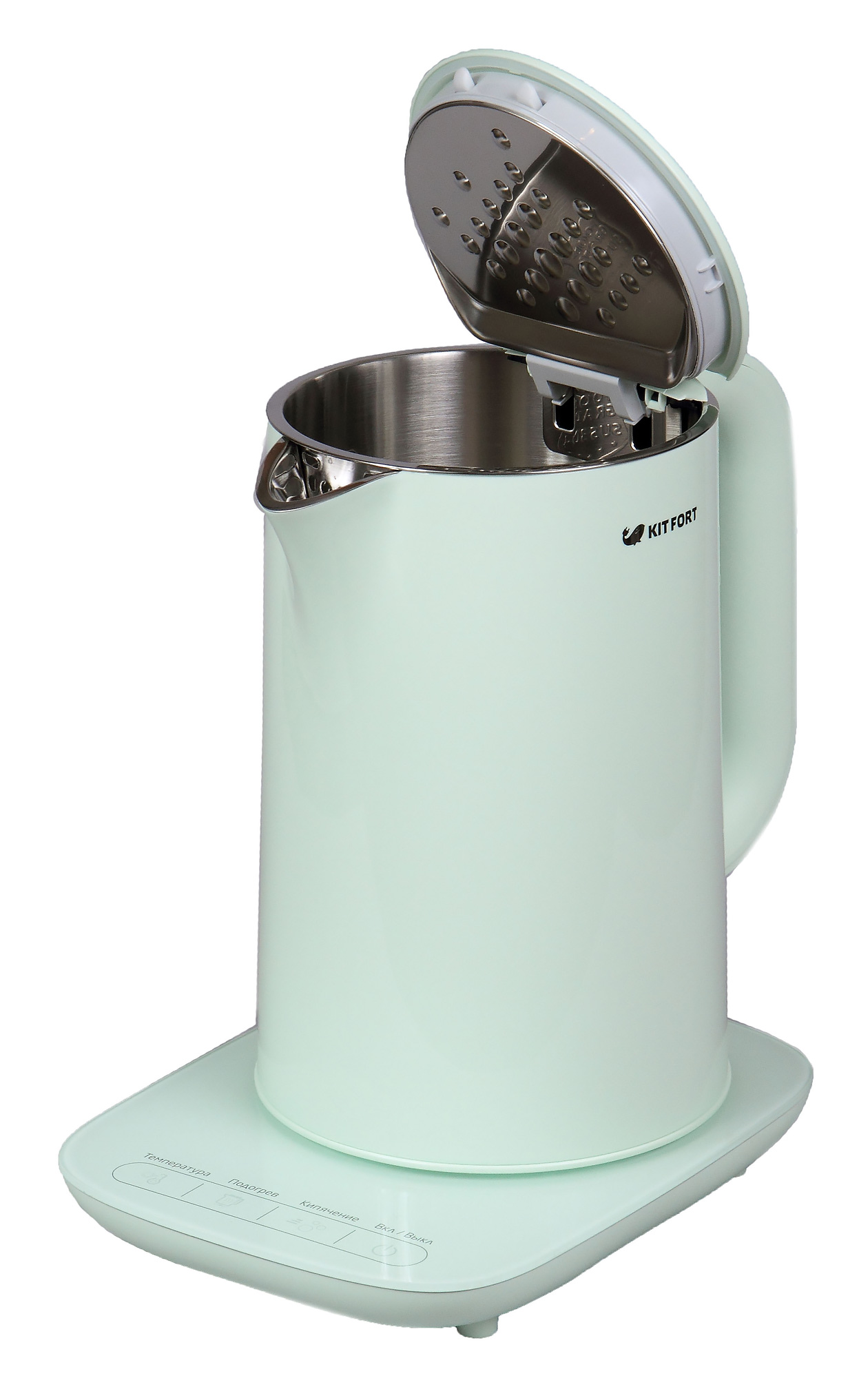 Несмотря на пластиковый обвес, KT-629 имеет цельнометаллическую колбу из нержавеющей стали, на внутренней стороне которой выдавлена надпись «Food Grade SUS 304». Это одна из популярных на рынке марок пищевой стали, но мы другой в чайнике увидеть и не ожидали, поэтому «в чем прикол» — не очень понятно.