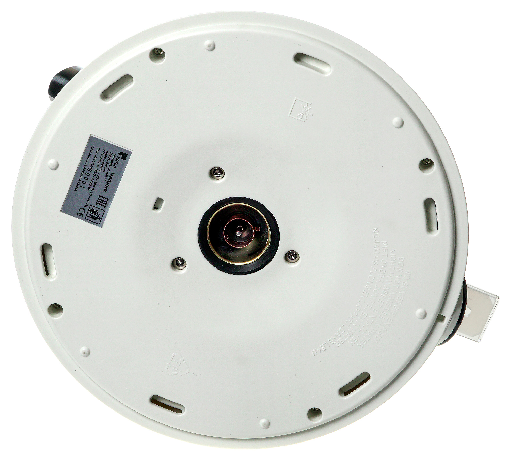 Нижняя сторона чайника предсказуемо проста — круглый разъем для подключения базы и шильда с названием модели, техническими характеристиками, серийным номером и информацией о стране производства.