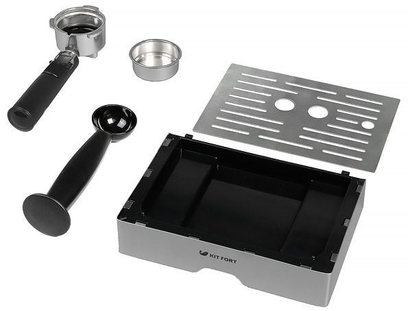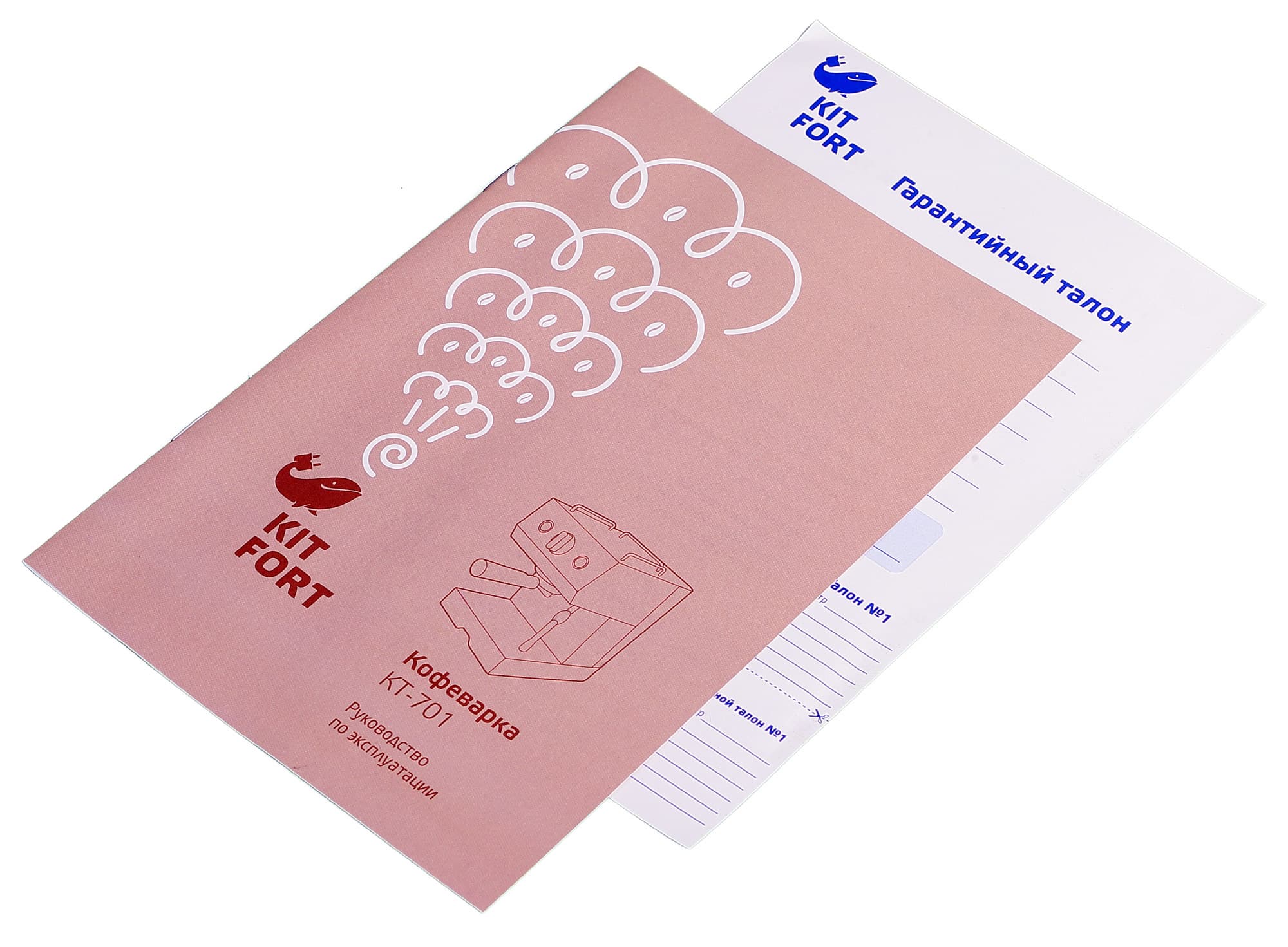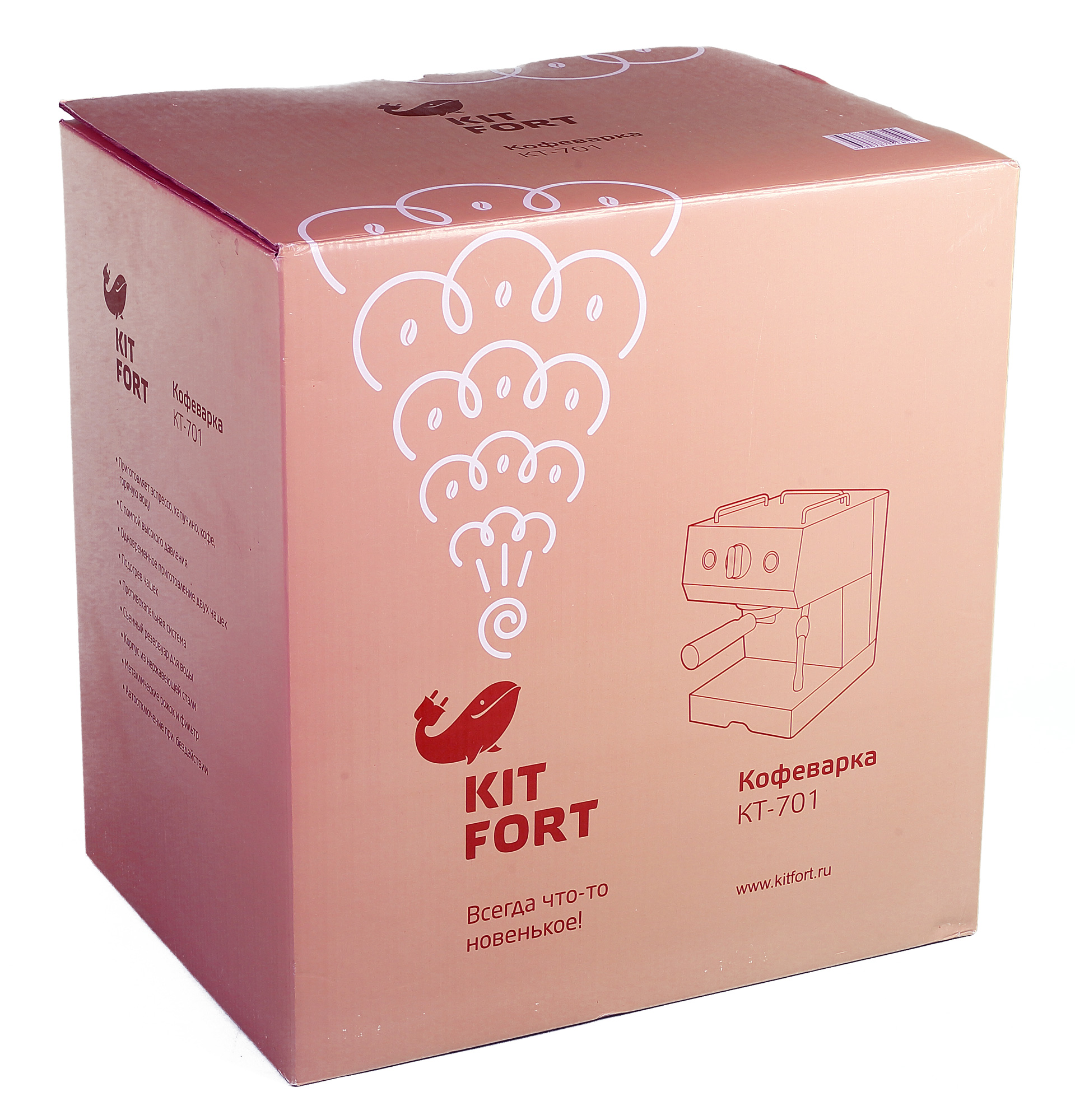 Kitfort KT-701 производит впечатление качественно выполненной рожковой кофеварки с капучинатором вполне классической конструкции. Основные отличия от других устройств того же типа: довольно большой размер как самого устройства, так и емкости для воды, «угловатый» стальной дизайн, удобные эргономичные органы управления, простота и понятность конструкции.