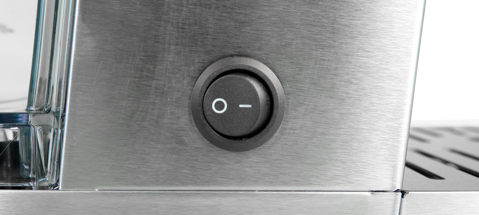 Кнопка включения/выключения расположена на левом боку устройства. На время длительного отсутствия ею, пожалуй, имеет смысл воспользоваться, но если вы пользуетесь кофеваркой часто, выключать ее после каждого приготовления кофе с помощью этой кнопки особенного смысла нет: после 25 минут бездействия прибор отключится автоматически.