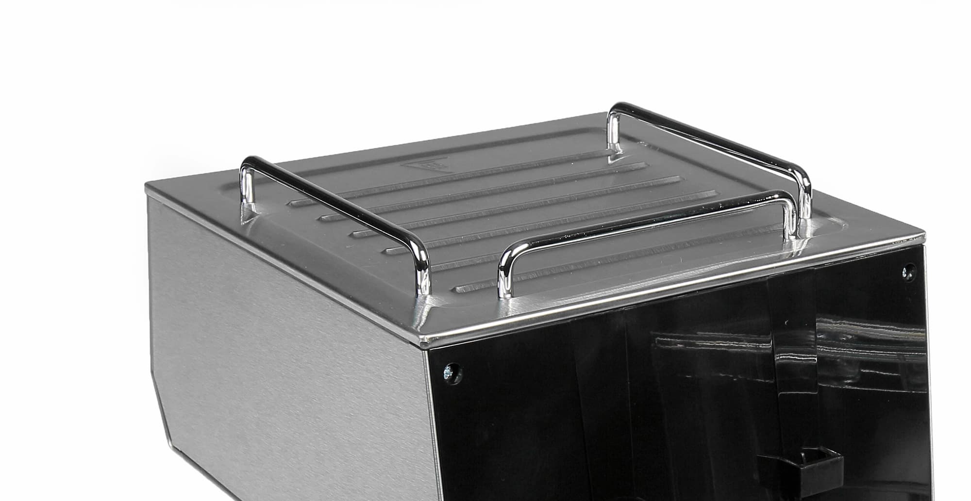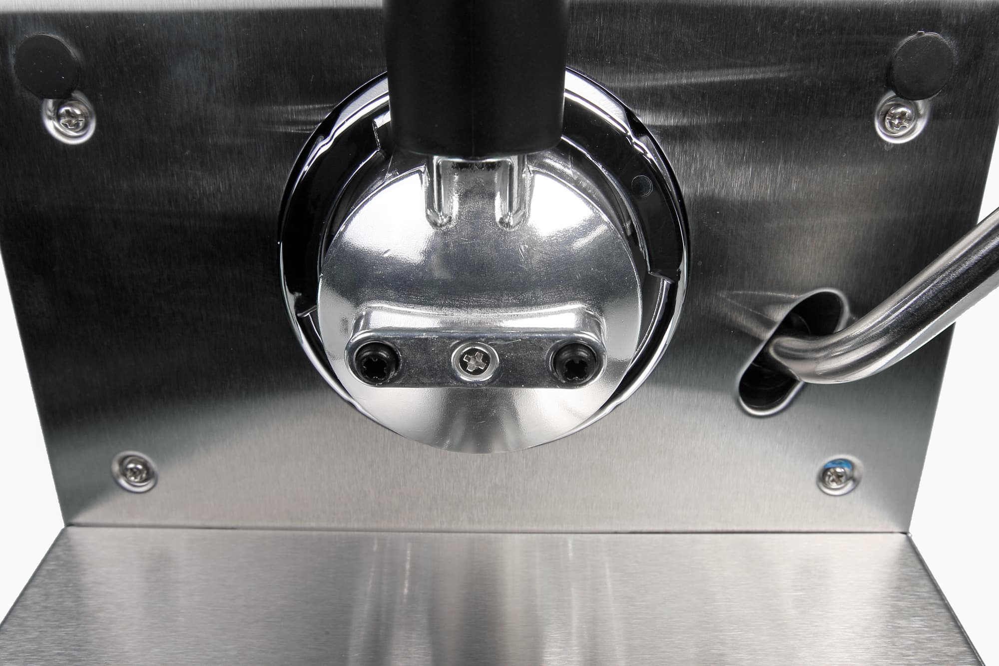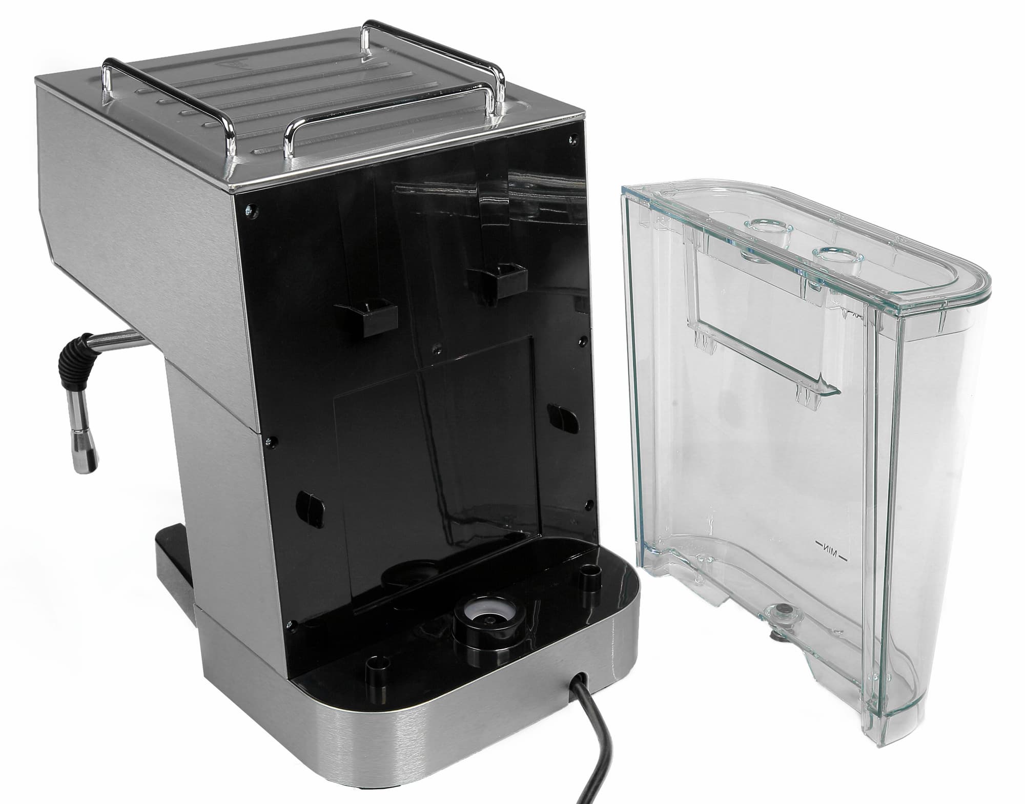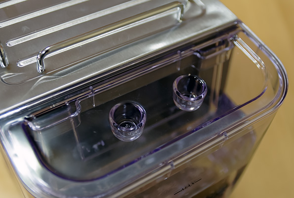 Емкость с водой легко снимается и устанавливается обратно, пружинный клапан внизу не позволяет воде выливаться, если емкость не установлена в кофеварку, что позволяет снять сосуд и сходить с ним за водой. А можно просто открыть крышку бака и налить воды сверху. Открывать ее очень удобно благодаря остроумной и оригинальной форме «ручки» — это просто два углубления, куда нужно засунуть пальцы и потянуть крышку вверх.