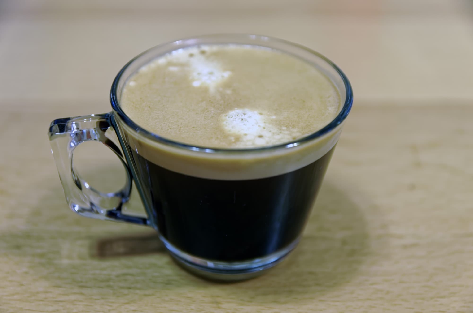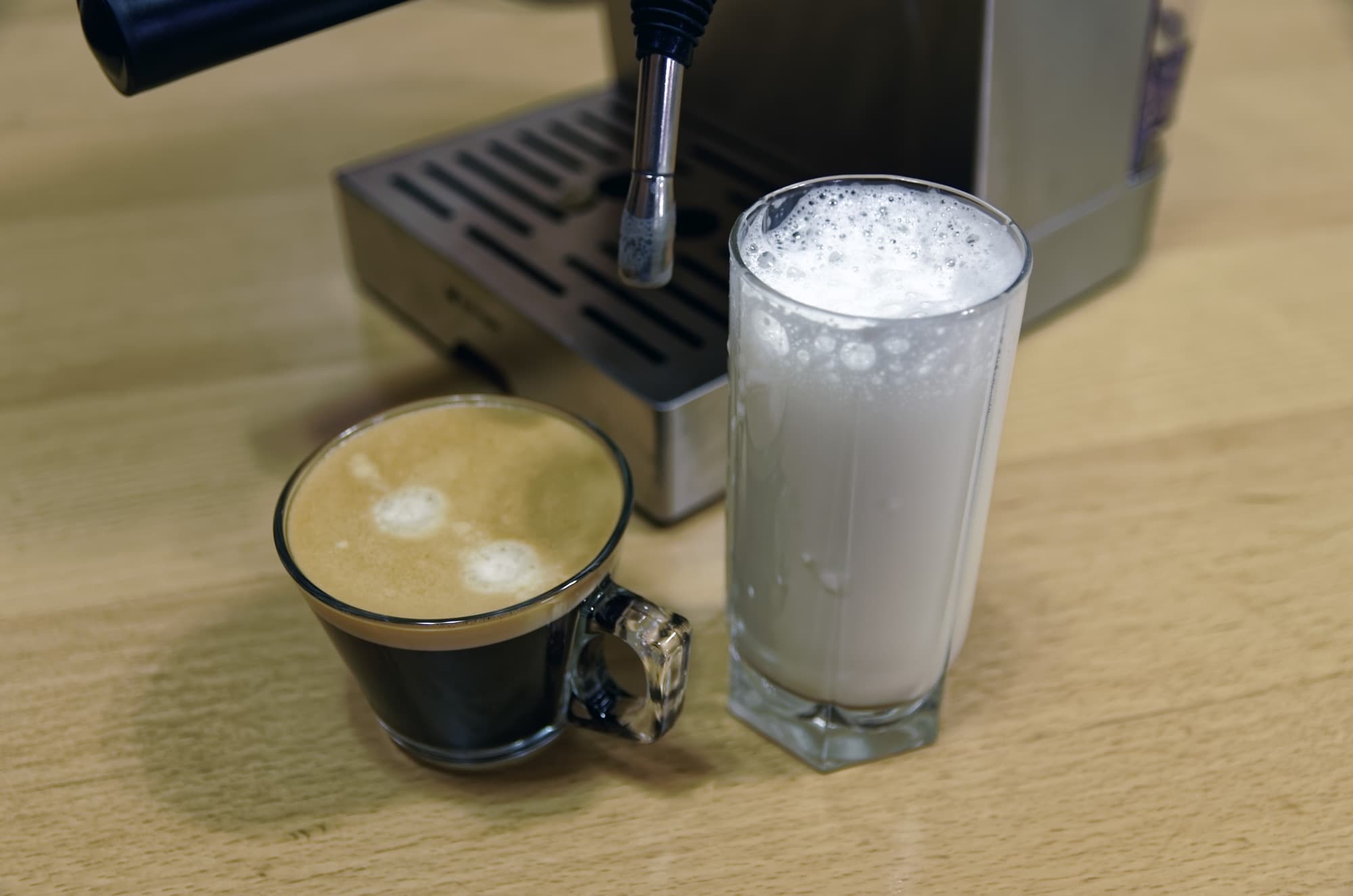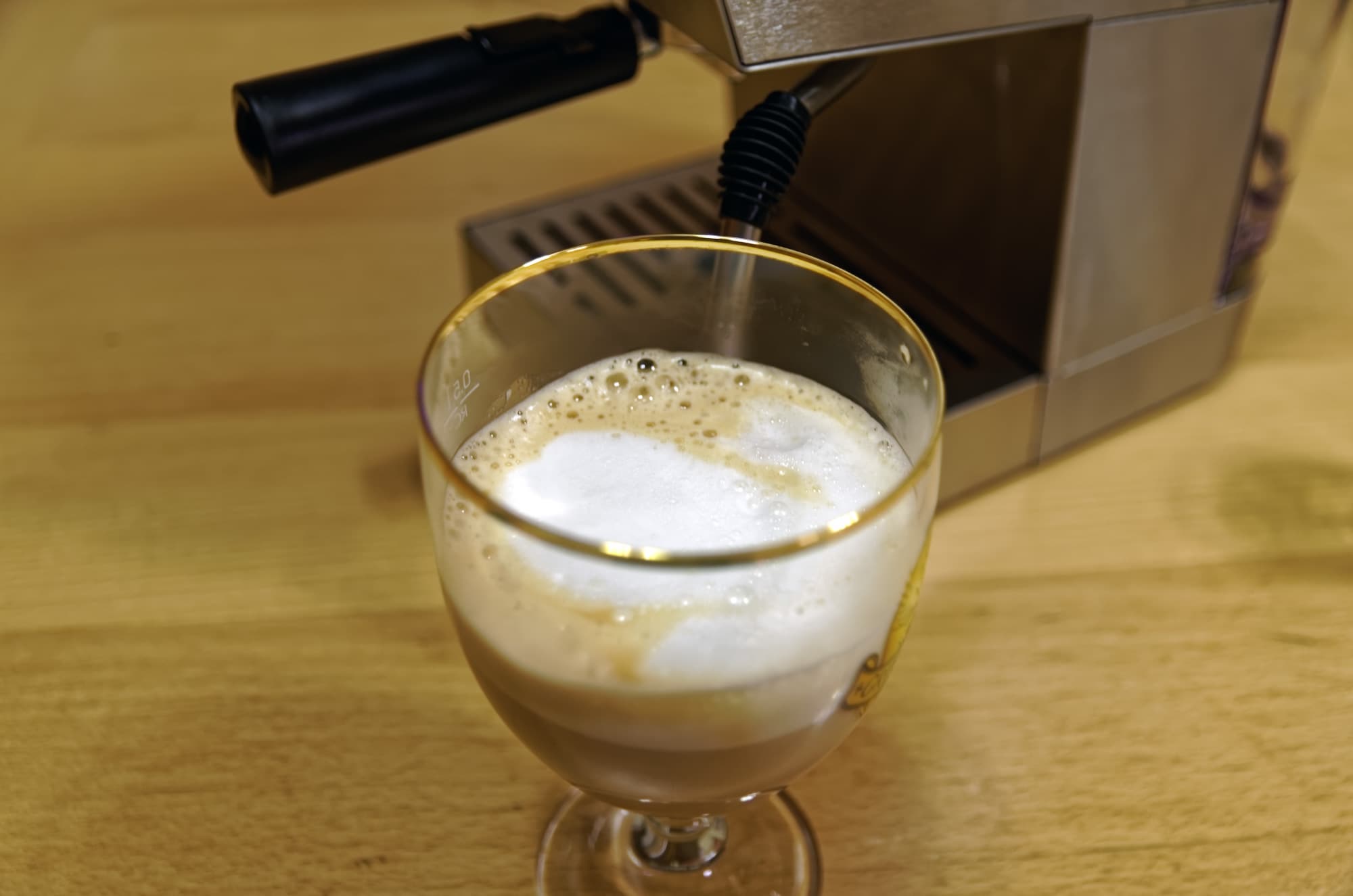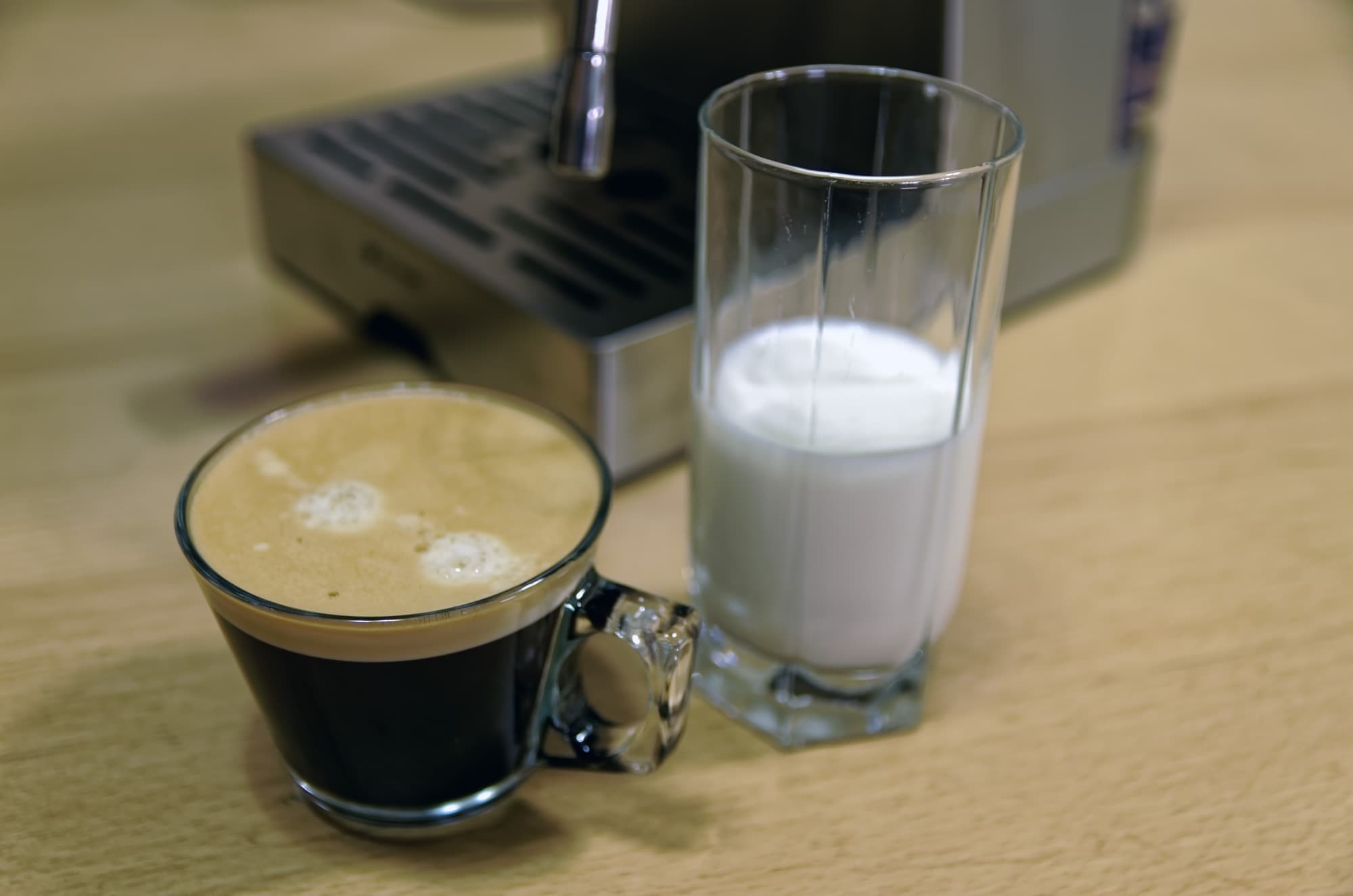 Согласно инструкции, мы сначала приготовили эспрессо, потом взяли узкий высокий стакан и залили туда молока примерно до половины высоты.