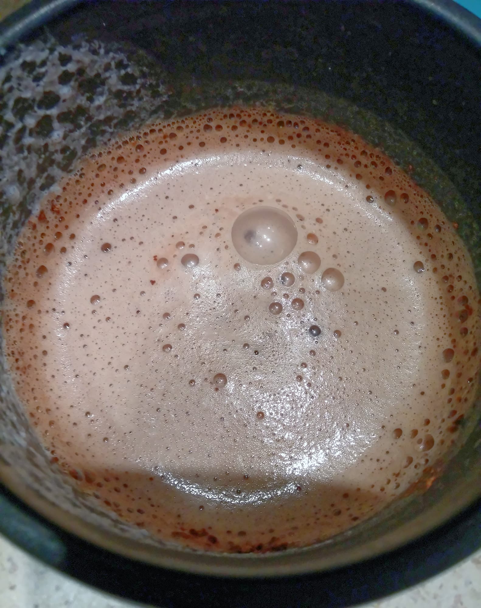Вдохновившись опытом с какао, мы решили превратить капучинатор в турку. Мы налили в чашу 200 мл воды, добавили 2 чайных ложки с горкой недорогого молотого кофе и запустили первую программу из любопытства. Венчик для взбивания покорно перемешал кофе с водой, но полной однородности напитка достичь не удалось, и мы запустили теперь уже правильную программу подогрева с правильным венчиком для смешивания. Напиток получился вполне похожим на кофе, а функциональность прибора неожиданно расширилась.