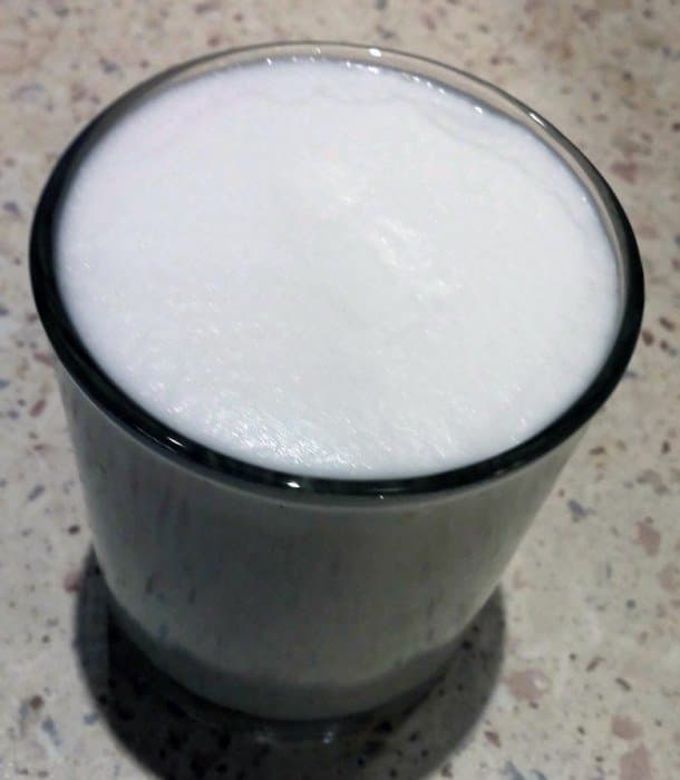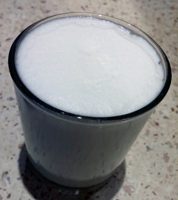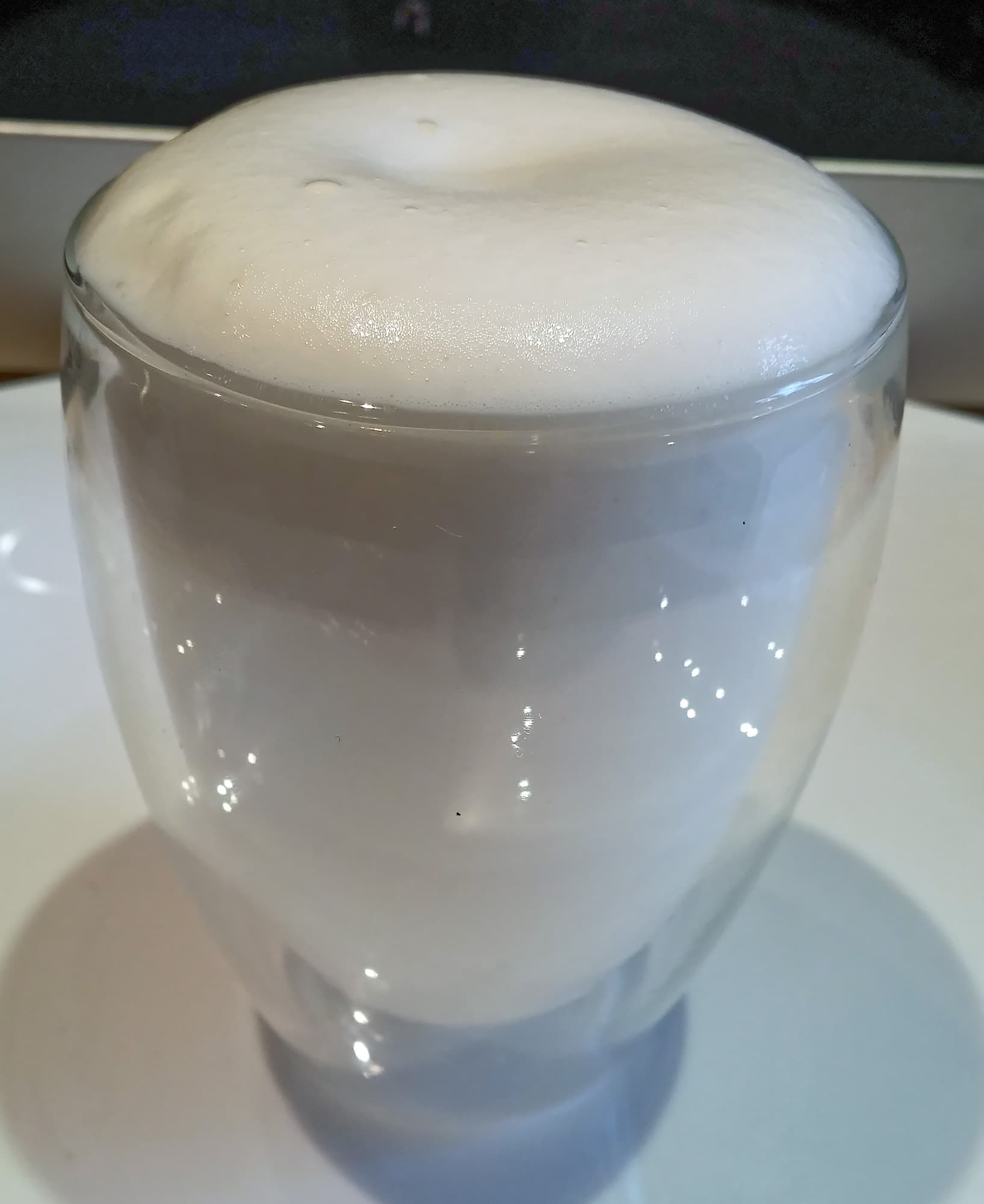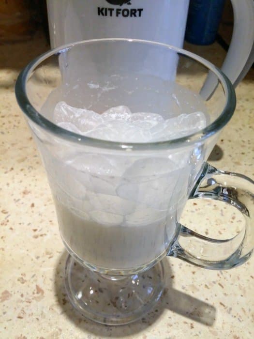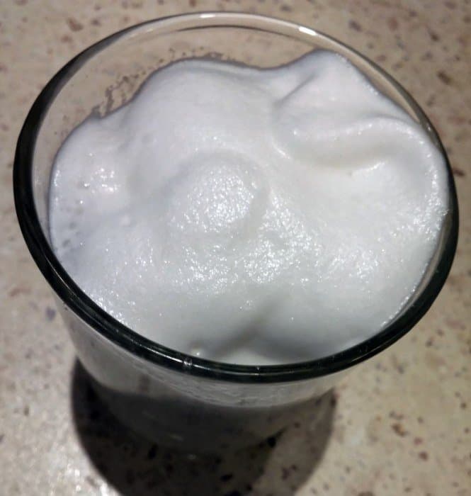 Холодное молоко за 1,5 минуты увеличилось в объеме в 2 раза, пена была мелкопузырчатая и занимала примерно 60% стакана, однако после манипуляций с переливанием начала довольно быстро опадать.