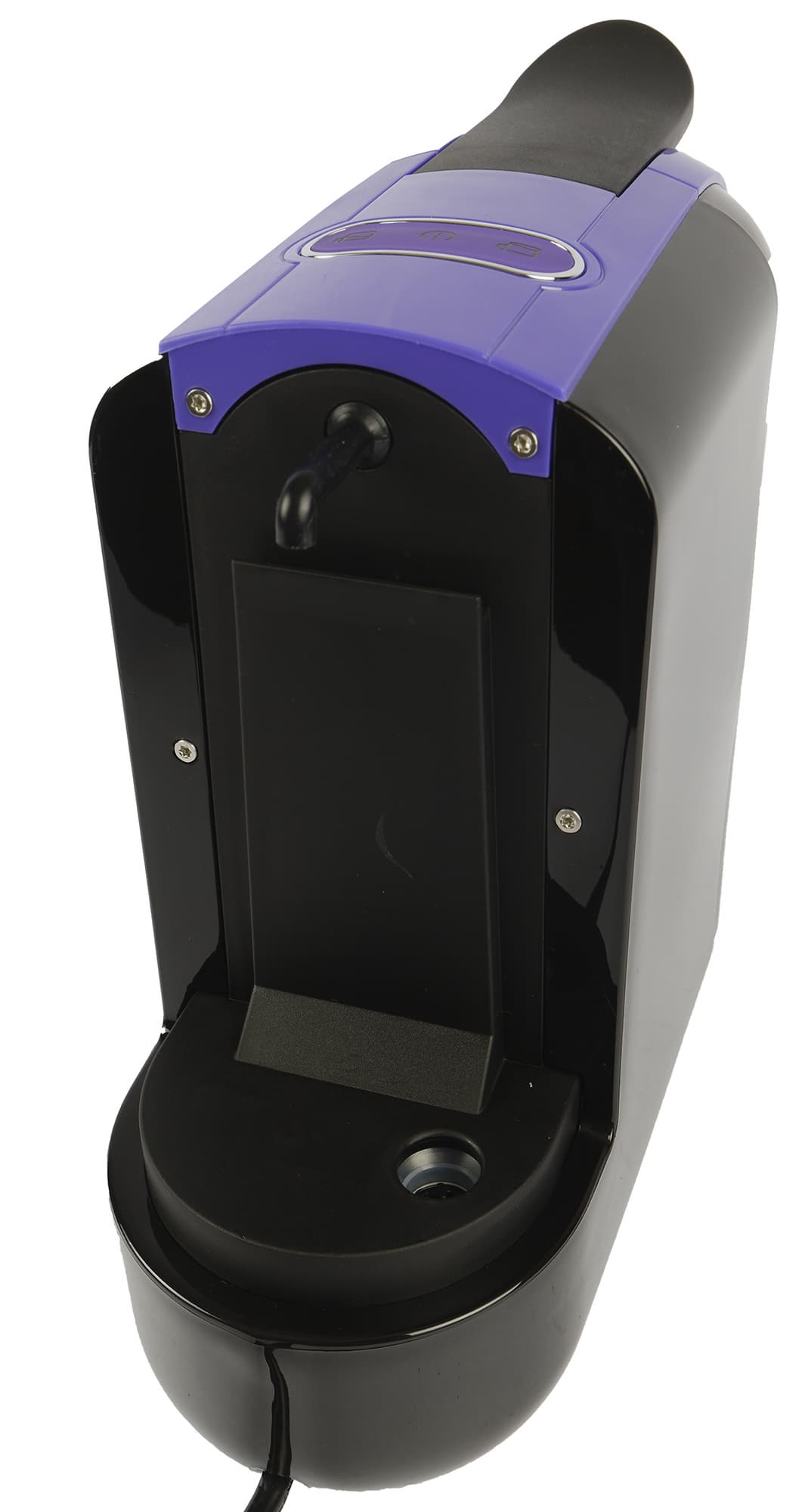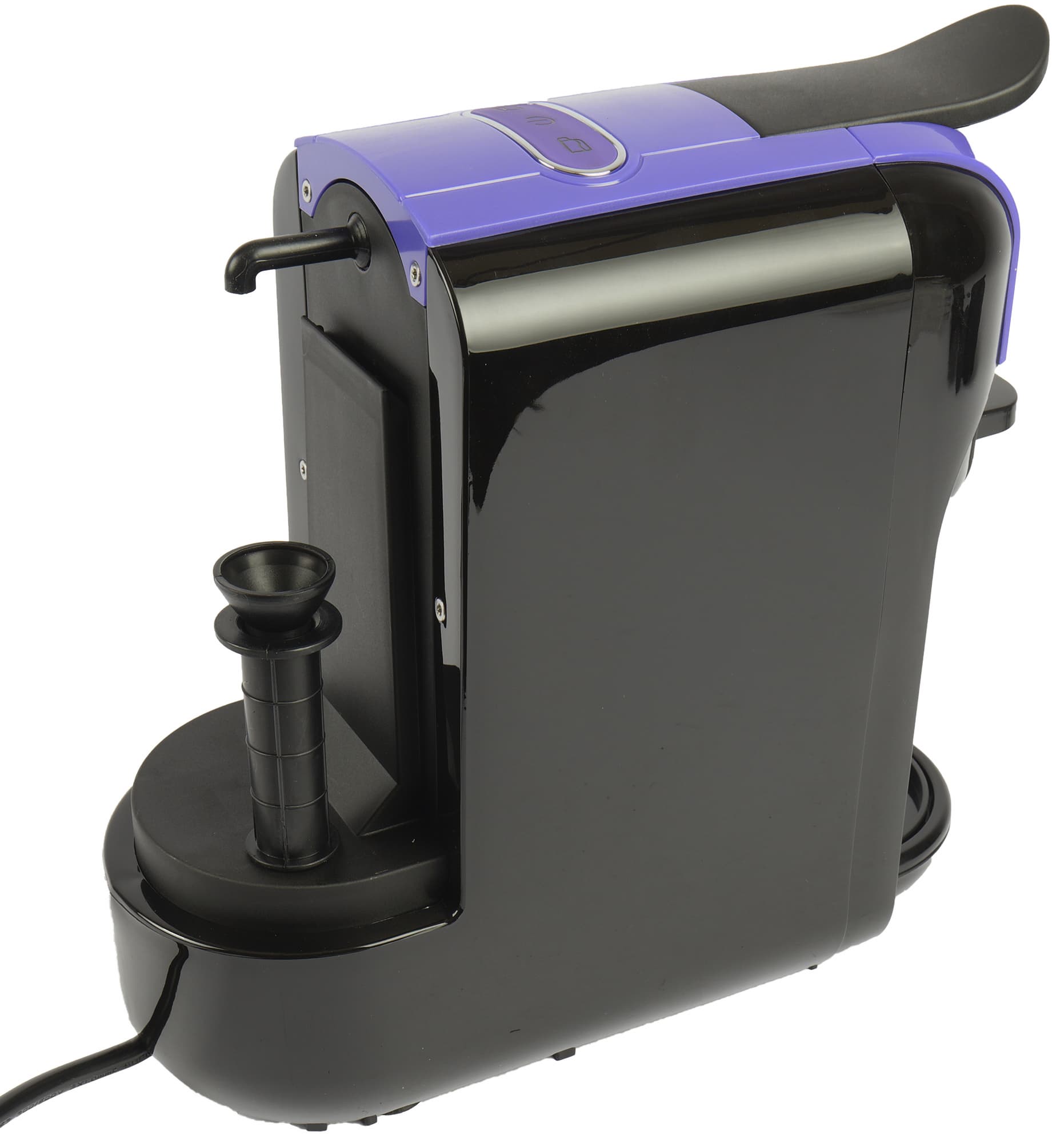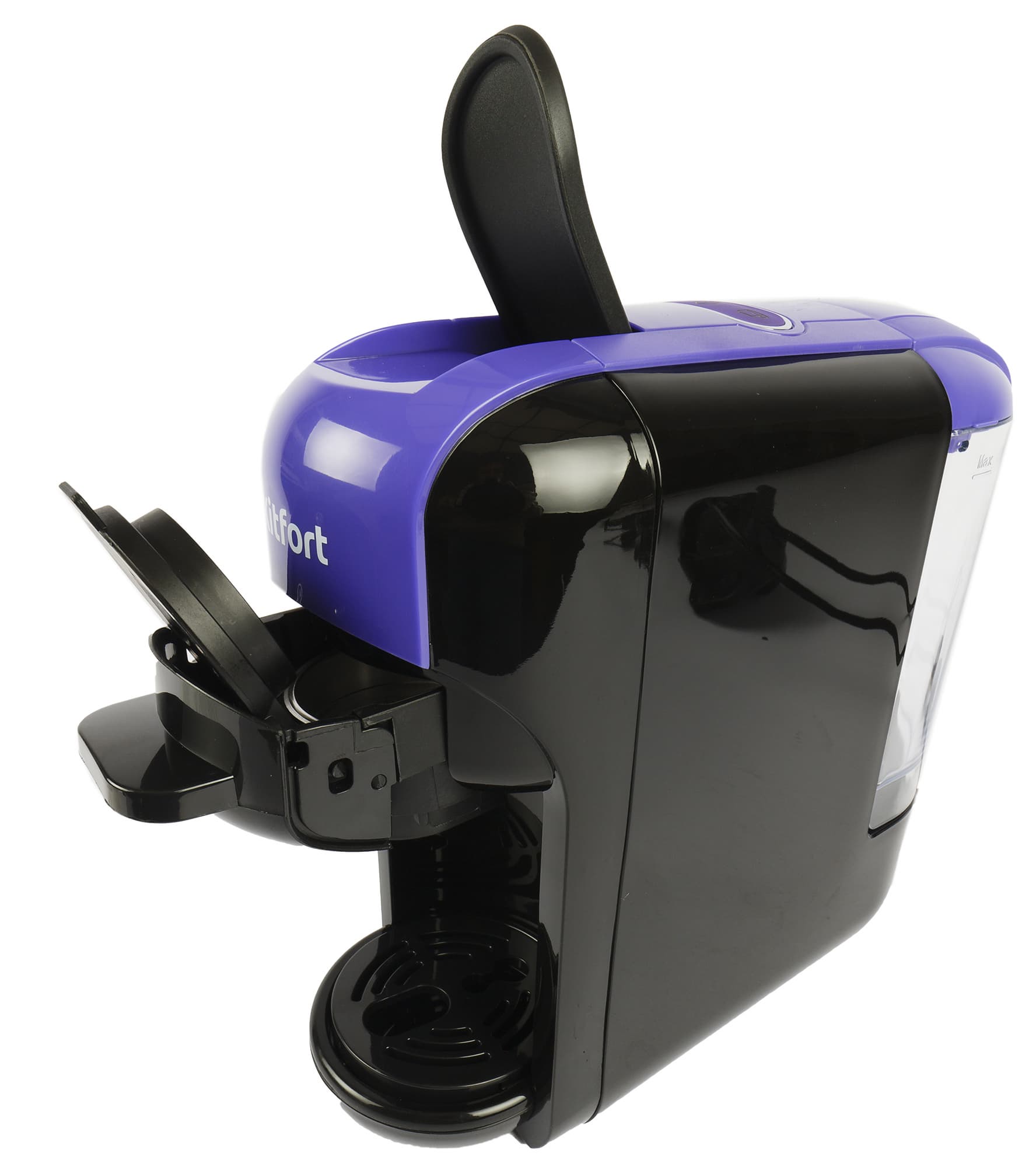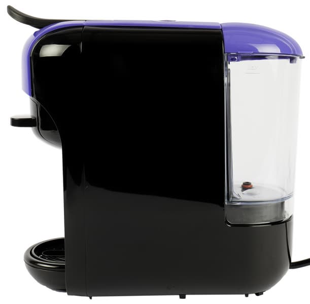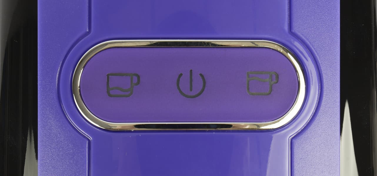Визуально кофеварка производит более чем приятное впечатление: нам понравился и внешний вид, и качество сборки, и общий дизайн устройства. Корпус прибора сделан из черного глянцевого и фиолетового пластика. На вид перед нами, конечно, не прибор премиум-класса, но вполне достойный гаджет, который будет удачно смотреться как дома, так и в офисе или переговорной комнате. Сразу отметим единственную визуальную претензию — цвет пластика верхней панели и крышки бака для воды слегка различаются. Это, конечно, мелочь, однако внутренний перфекционист не может не отметить такую нестыковку.