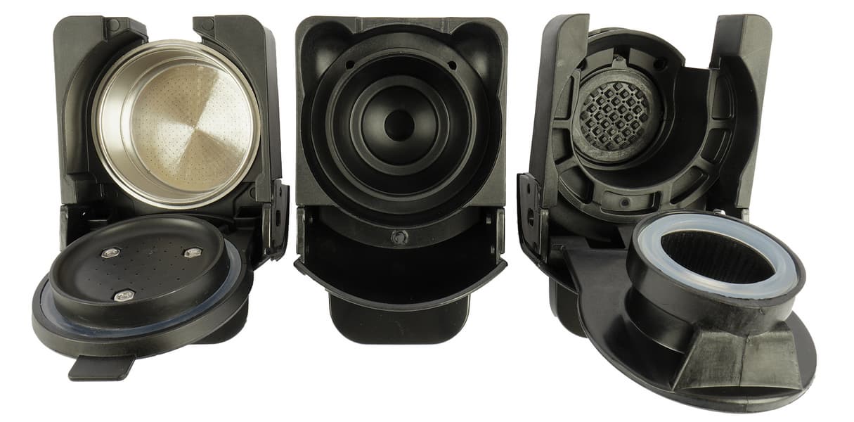 Адаптеры для различных типов кофе выполнены в едином форм-факторе, однако изнутри выглядят по-разному. Адаптер для Dolce Gusto (по центру) похож на простой пластиковый держатель, адаптер для молотого кофе (слева) оснащен крышечкой и металлическим фильтром с двойным дном («улучшайзером») — точно таким же, какой можно встретить у многих бюджетных рожковых кофеварок. Адаптер для капсул Nespresso (справа) имеет специальную крышечку с выступами для перфорации фольги.