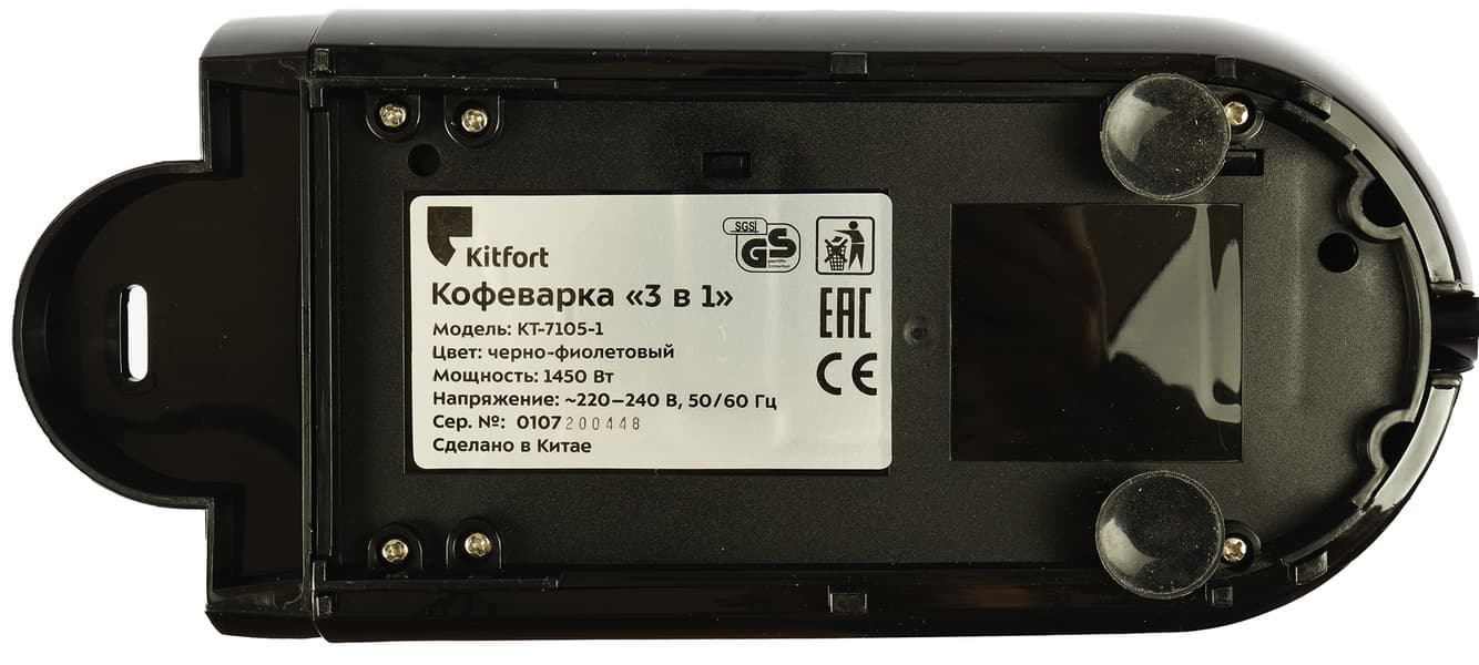 Снизу у кофеварки мы видим наклейку с технической информацией и резиновые ножки-присоски.