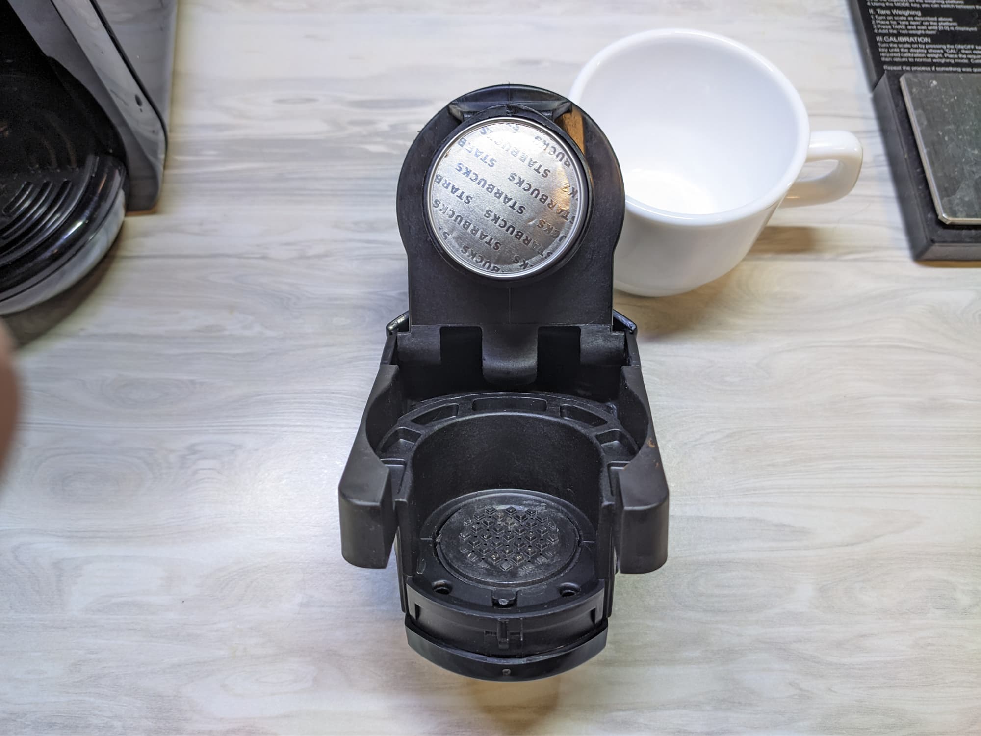 Мы поместили капсулу в переходник, крепко закрыли крышку руками, продавив тем самым фольгу, и поставили переходник в кофеварку.