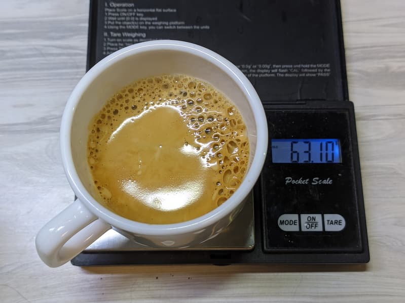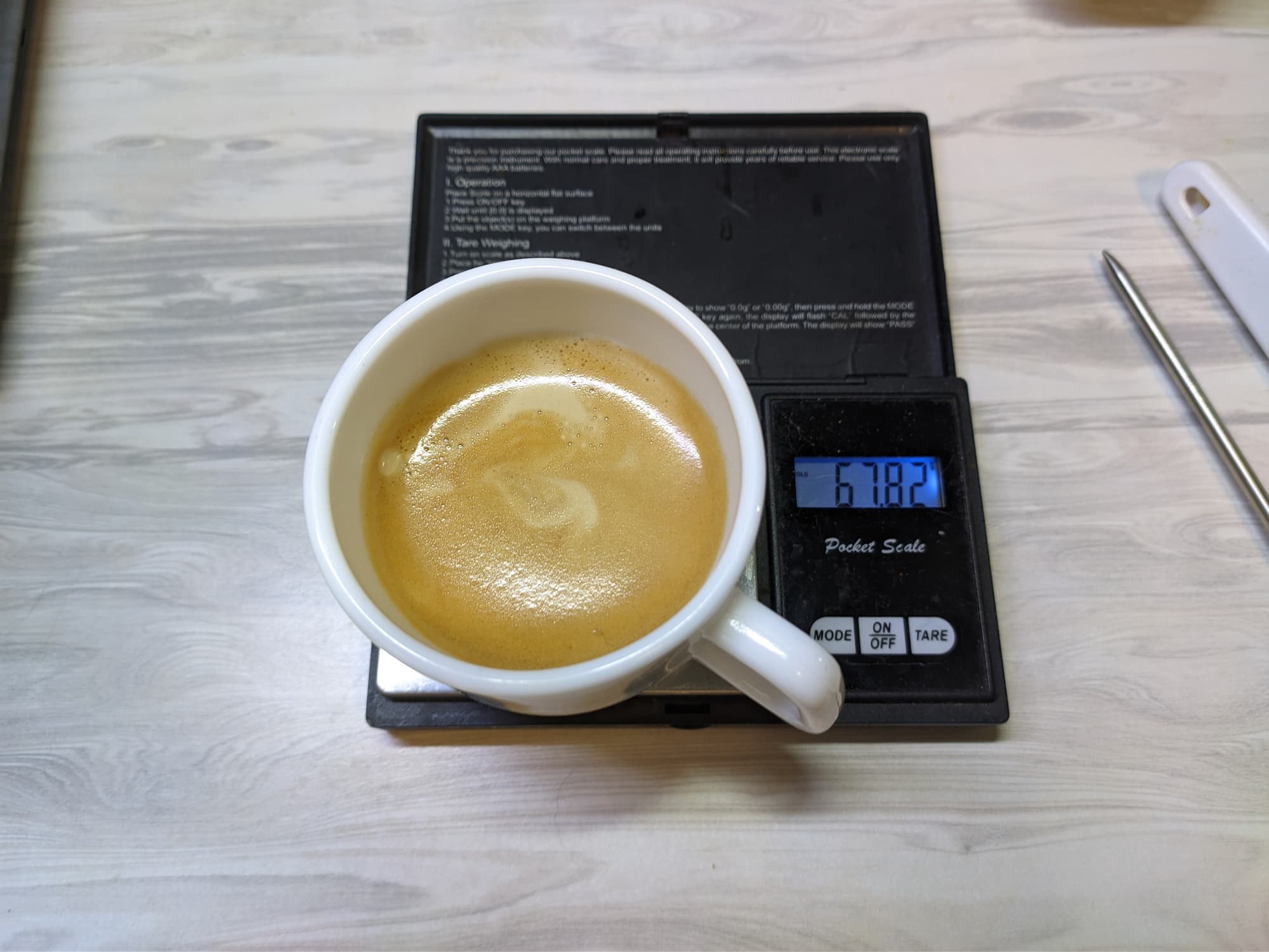 Затем нажали кнопку приготовления эспрессо и стали ждать. Общее время приготовления составило 30 секунд, по истечении которых в чашку пролилось 68 граммов напитка.