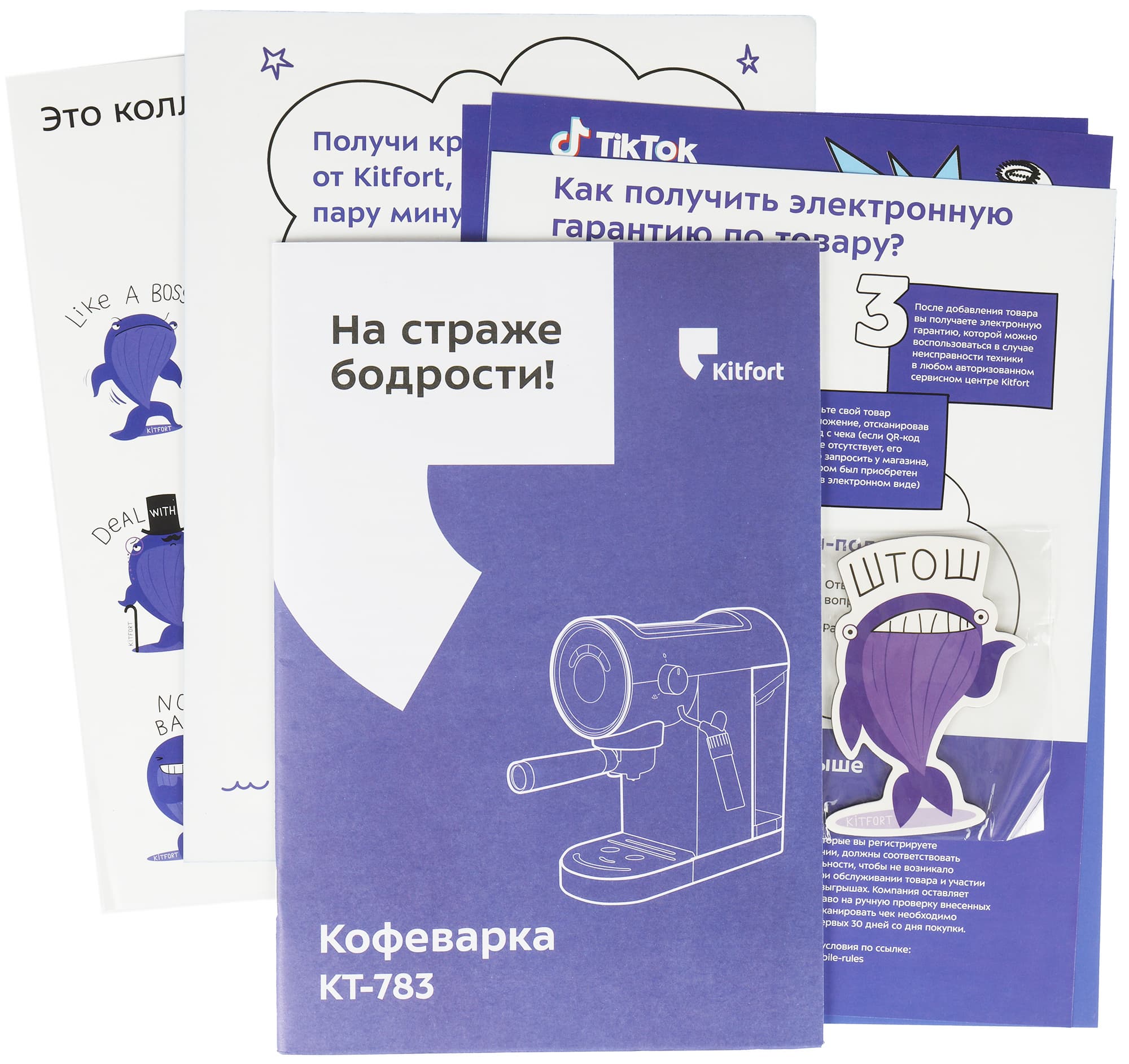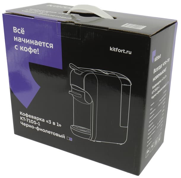 Кофеварка поставляется в картонной коробке, оформленной в фирменном стиле Kitfort. Упаковка легко опознается буквально с первого взгляда: используются фирменные шрифты, фиолетово-нейтральная цветовая гамма. На упаковке, как водится, размещено векторное изображение устройства, на боковых гранях можно найти его основные характеристики. На лицевой стороне — традиционный слоган (на этот раз — «Все начинается с кофе!»).