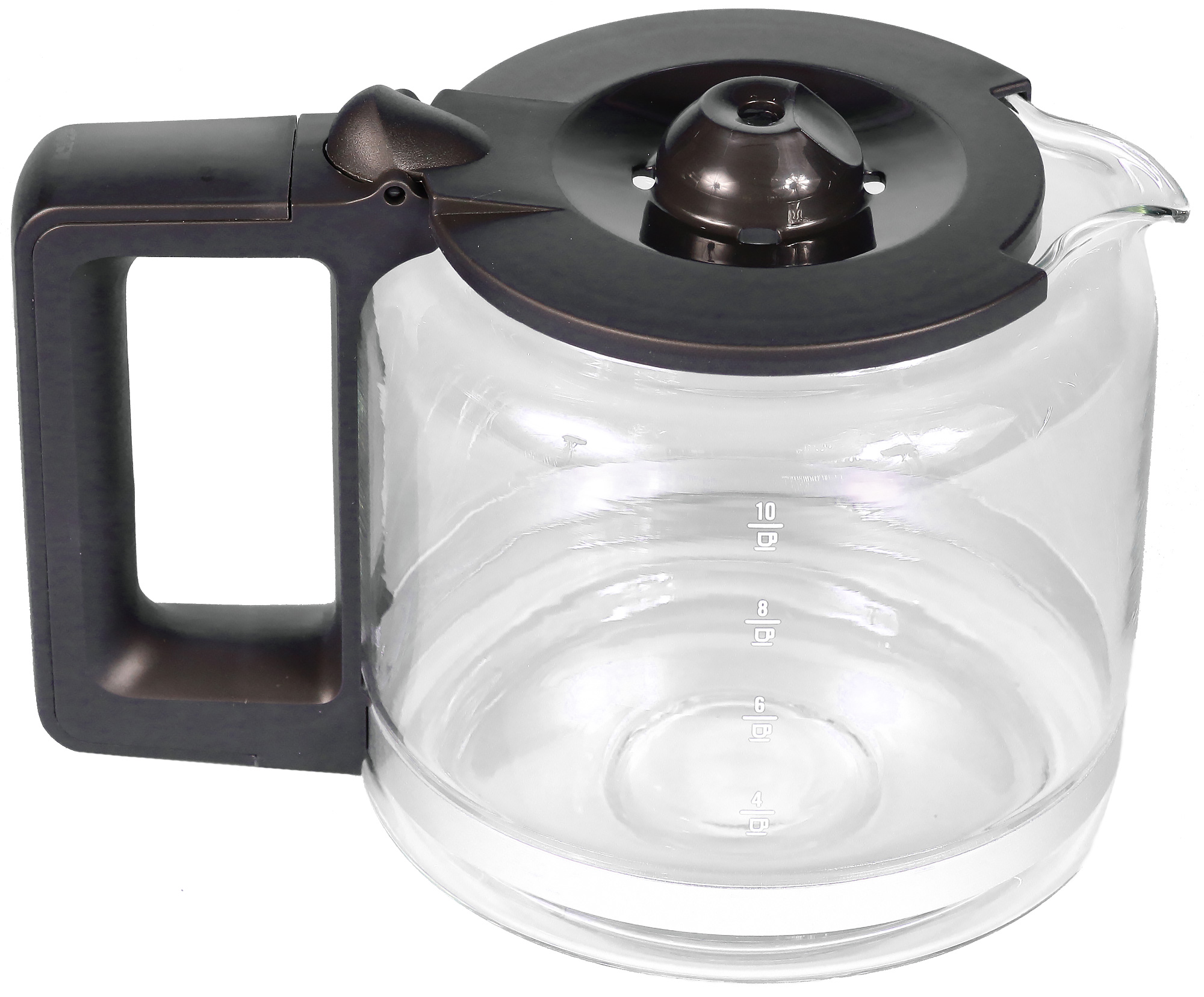 Стеклянный кофейник оснащен пластиковой ручкой и пластиковой же открывающейся крышкой. На стенке кофейника нанесена градуировка, соответствующая 2, 4, 6, 8 и 10 чашкам кофе. Воспользоваться другой емкостью вместо штатного кофейника не получится: его крышка нажимает на клапан антикапельной системы, включая тем самым подачу готового напитка.