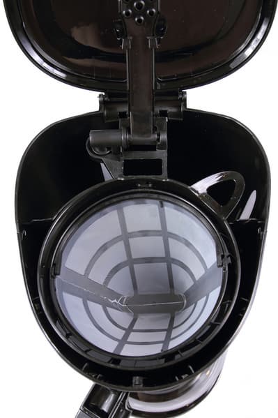 Отсек для заваривания кофе находится под той же крышкой. Состоит он из пластиковой воронки в сборе с антикапельным механизмом и многоразового нейлонового фильтра с ручкой, который при желании можно заменить на бумажный.