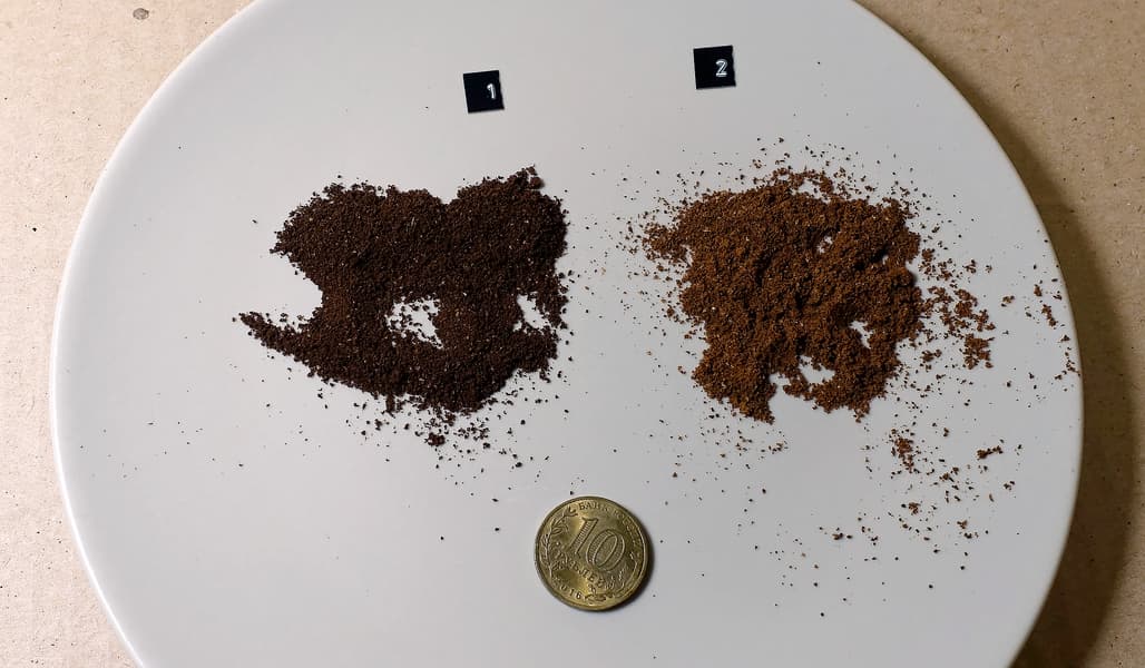 Мы, как уже упоминалось, проводили все опыты на одних и тех же кофейных зернах, только часть нам смололи в магазине, а часть перемалывала уже наша кофемашина. Под конец тестирования мы решили безо всяких измерений просто сравнить образцы этих двух помолов, а затем и полученные из них напитки.