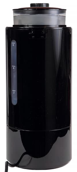 Собственно, выдает кофемашину лишь небольшой островок прозрачного пластика сверху — это отсек для зерен. Посередине отсека располагается поворотная ручка, с помощью которой пользователь регулирует степень помола. На ручке нанесена шкала, выполненная в виде ряда последовательно уменьшающихся кругов. Сверху контейнер закрывается черной пластиковой крышкой.
