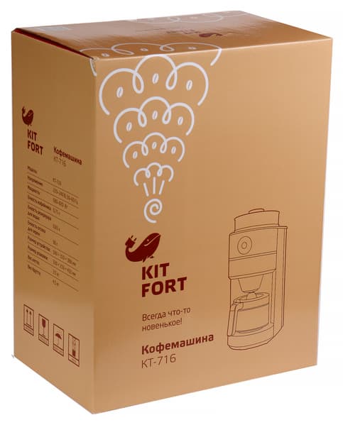 Недавно мы публиковали обзор капельной кофеварки Kitfort KT-715. Прибор, о котором пойдет речь в этот раз, отличается всего на одну цифру в номере модели, но стоит в четыре раза больше. Тут не кроется никакой сомнительной интриги, просто это аппарат со встроенной автоматической кофемолкой. Перемолотые зерна прибор отправляет в фильтр, после чего запускает процесс проливания порошка горячей водой. Это переводит устройство в ранг кофемашин — приборов, осуществляющих полный цикл варки кофе, от помола до получения порции напитка.