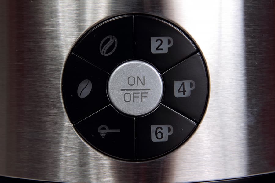 Под кофемолкой на фронтальной панели размещается панель управления. Весьма компактная и стильная, с центральной металлической кнопкой ON/OFF , от которой то ли лучами, то ли лепестками расходятся шесть кнопок.