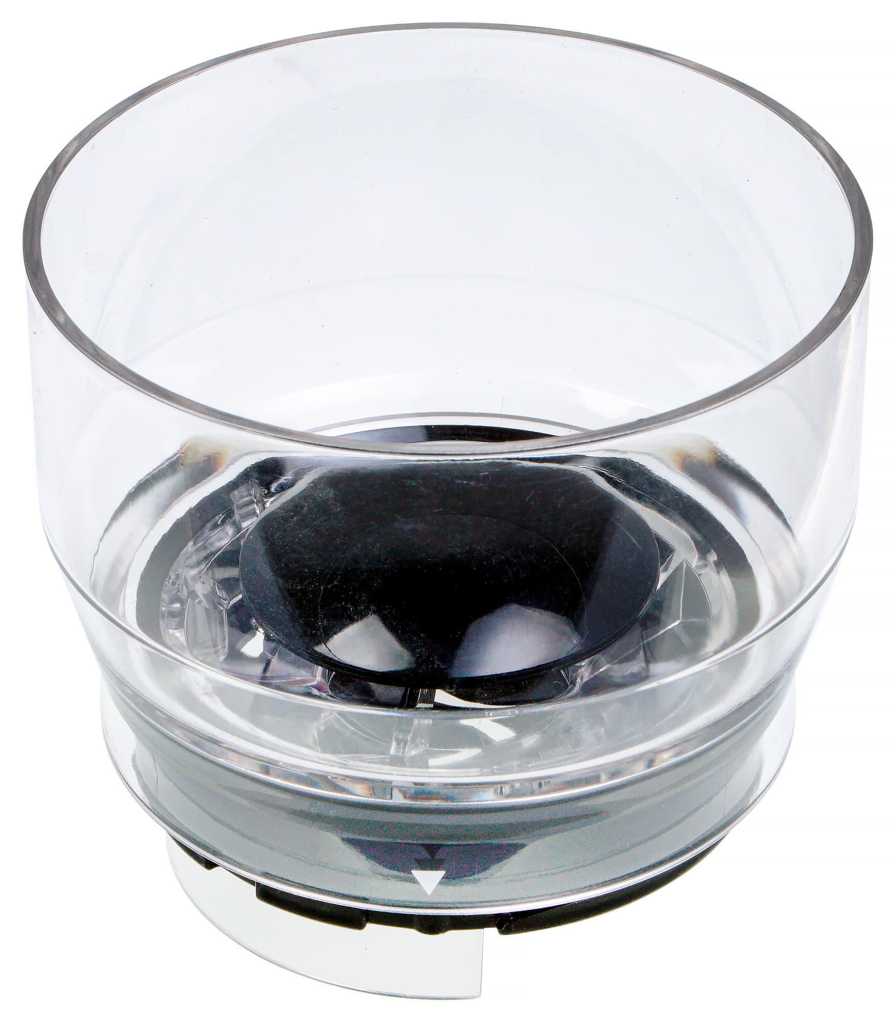Спереди у кофемолки можно увидеть место для установки бункера для помола емкостью 100 г — он устанавливается строго горизонтально (перпендикулярно оси корпуса) и фиксируется (защелкивается) с помощью небольшой подпружиненной «кнопки», расположенной на корпусе.