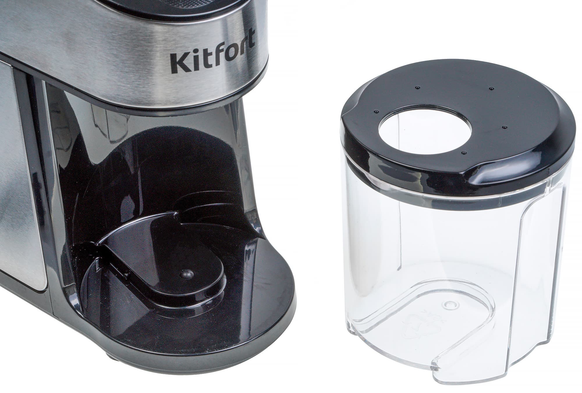 Отсек для зерен и помолотого кофе сделаны из прозрачного пластика, крышки — из черного непрозрачного.
