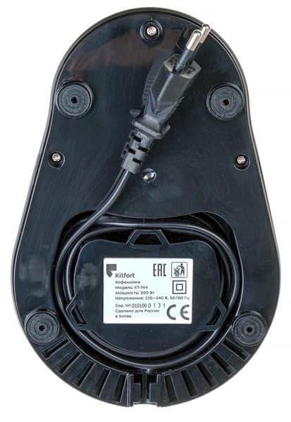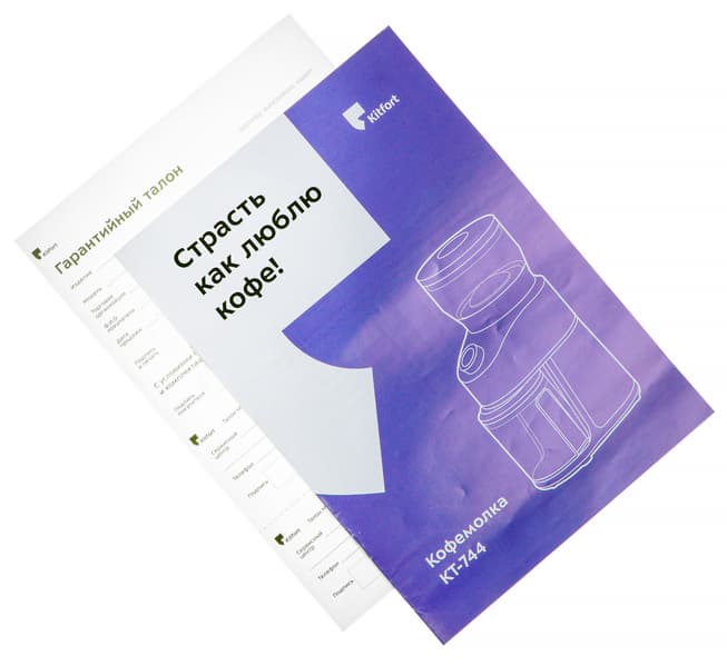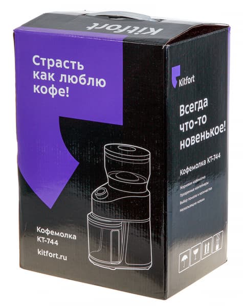 Кофемолка поставляется в картонной коробке, оформленной в фирменном стиле Kitfort: сочетание черного и фиолетового цвета, векторное изображение прибора, краткое описание его основных характеристик и особенностей, а также слоган — «Страсть как люблю кофе».