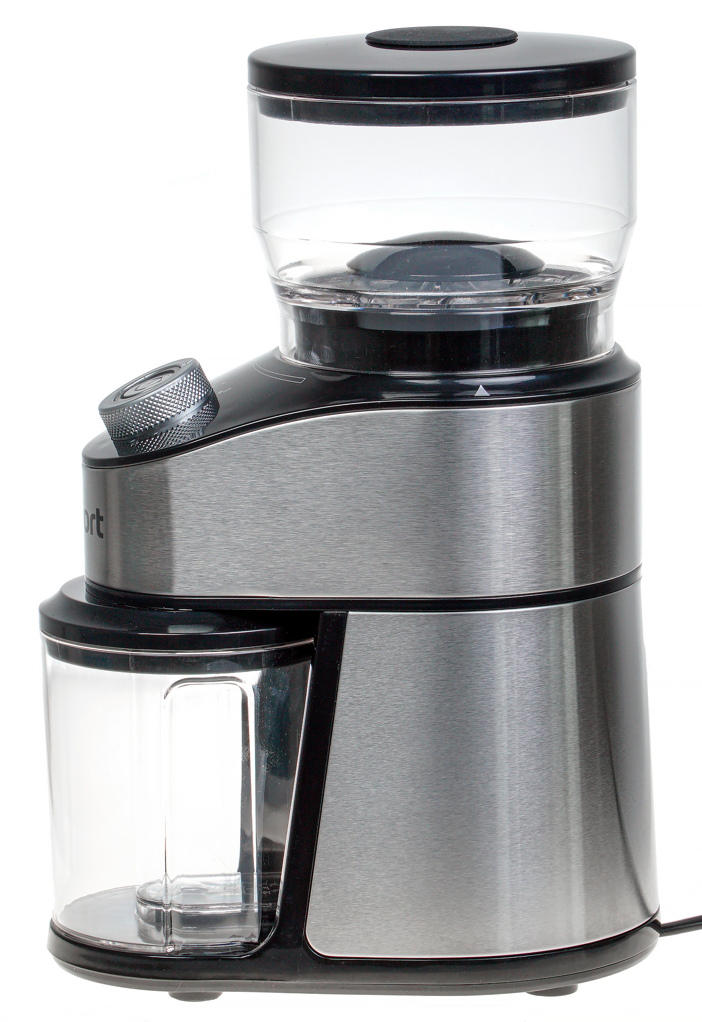 Также сверху у кофемолки расположены жернова, поверх которых устанавливается контейнер для подачи зерен (хоппер) с пластиковой крышкой.