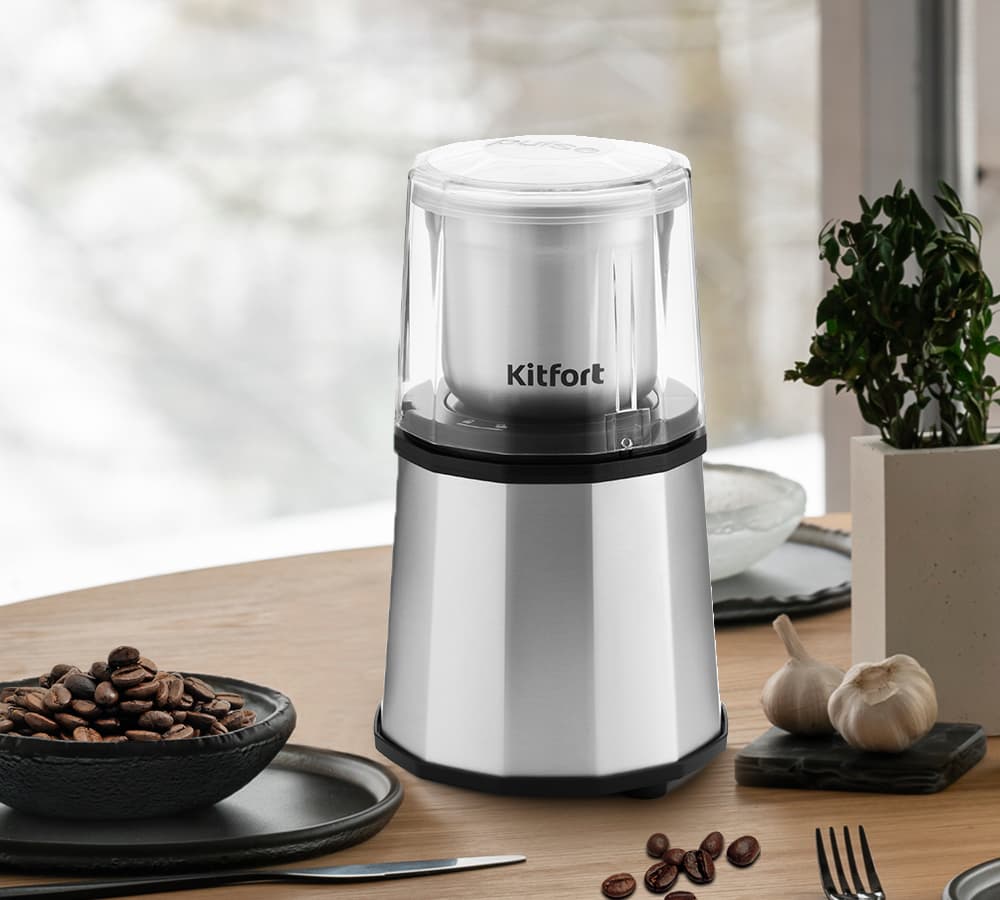 Герой нашего сегодняшнего обзора — кофемолка Kitfort KT-746. Она отличается наличием съемной металлической чаши с ножами, что хоть и привело к некоторому увеличению цены, но должно существенно облегчить процесс ухода за прибором (очистку чаши от остатков кофе или молотых специй).