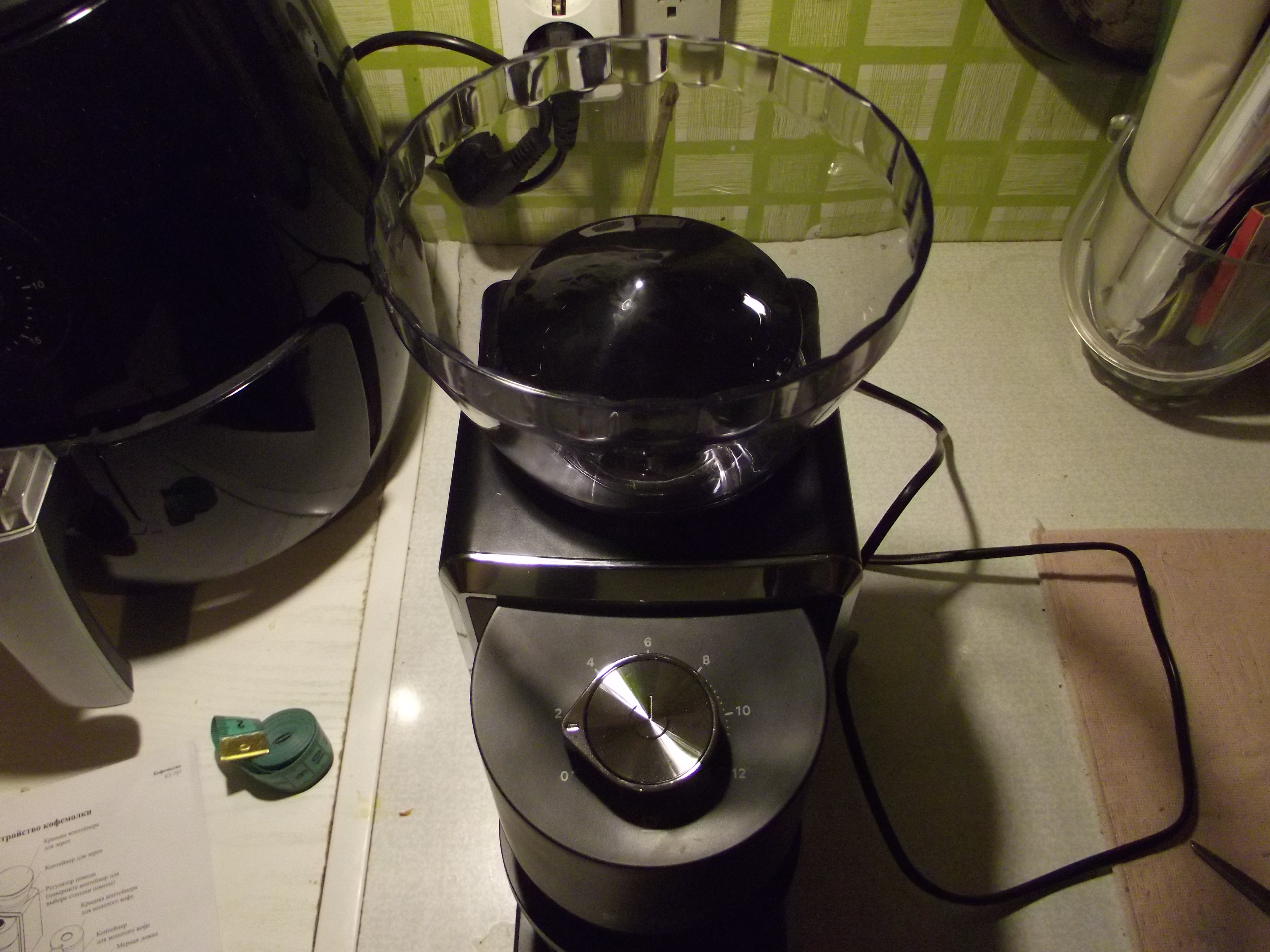 Все надписи на приборе нанесены на русском языке. Так, нарисованная шкала регулятора под чашей для зерен указывает на режимы «мелко», «средне», «крупно». Речь идет о степени помола. Самая тонкая — «в пыль» для турки, крупный — для варки в френч-прессе. В инструкции производителя не указано точное число степеней, рисок на шкале 21. Регулируются степени по щелчкам. На тонком помоле переход от совсем «в пыль» до менее плотного состояния лучше заметен визуально.