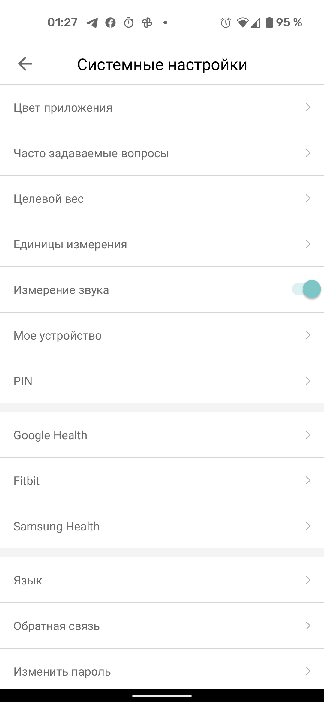 В разделе настроек можно ограничить доступ к приложению отдельным PIN-кодом, указать целевой вес, выставить единицы измерения, язык и внешний вид программы, а также настроить синхронизацию данных с аккаунтами в фитнес-приложениях Google Health, Fitbit и Samsung Health.