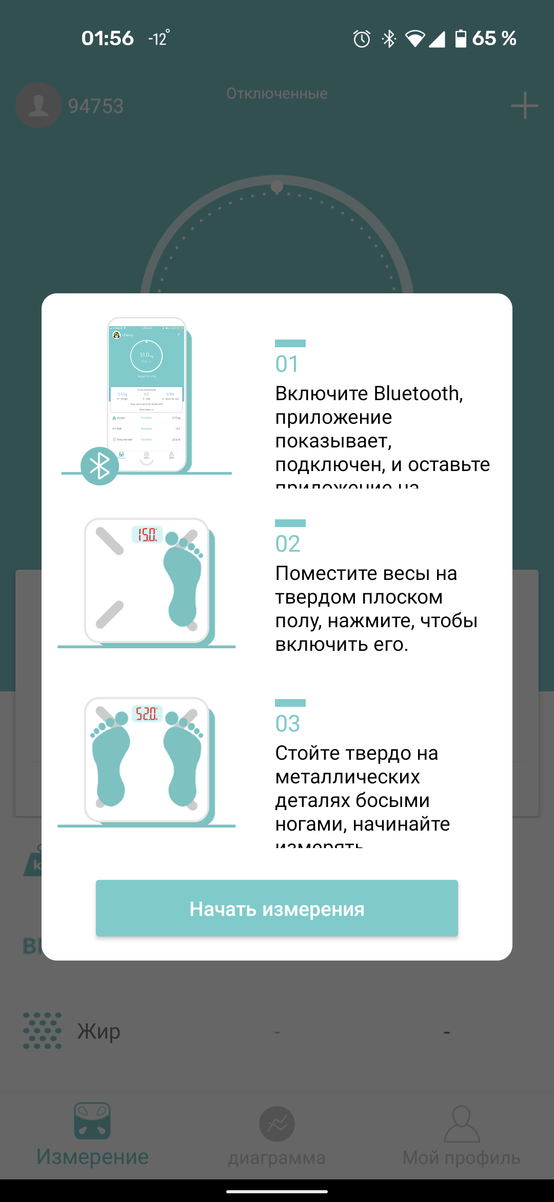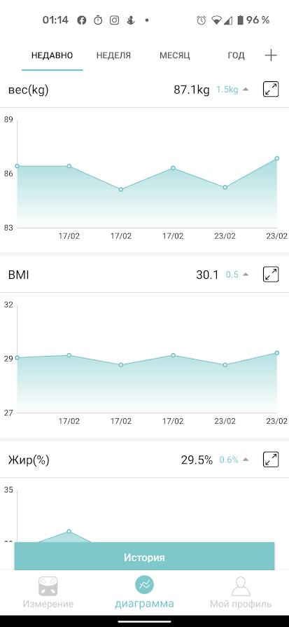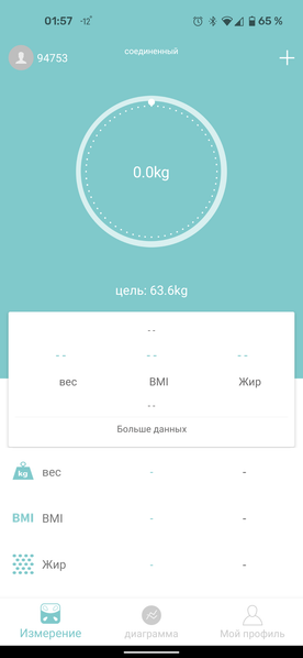 Перед первым измерением на главной странице есть только пустые графы для веса, индекса массы тела и процента жира.