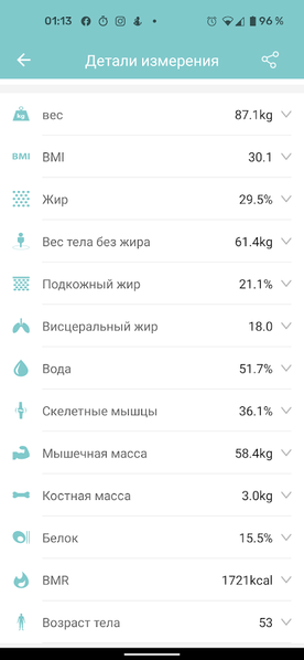 Нажатие на ссылку «Больше данных» открывает страницу с полными результатами измерений: помимо перечисленных данных, доступны вес тела без жира, количество подкожного и висцерального жира, содержание воды в теле, процент скелетных мышц, мышечная и костная масса, процентное содержание белка, рекомендуемое суточное потребление калорий и некий «возраст тела».