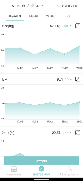 Первых порадует лаконичный, легко читаемый дисплей с минимумом дополнительной информации, а вторые получат удовольствие, наблюдая за изменениями индекса массы тела, процентным содержанием мышечной массы и жира в организме на большом количестве удобных графиков.