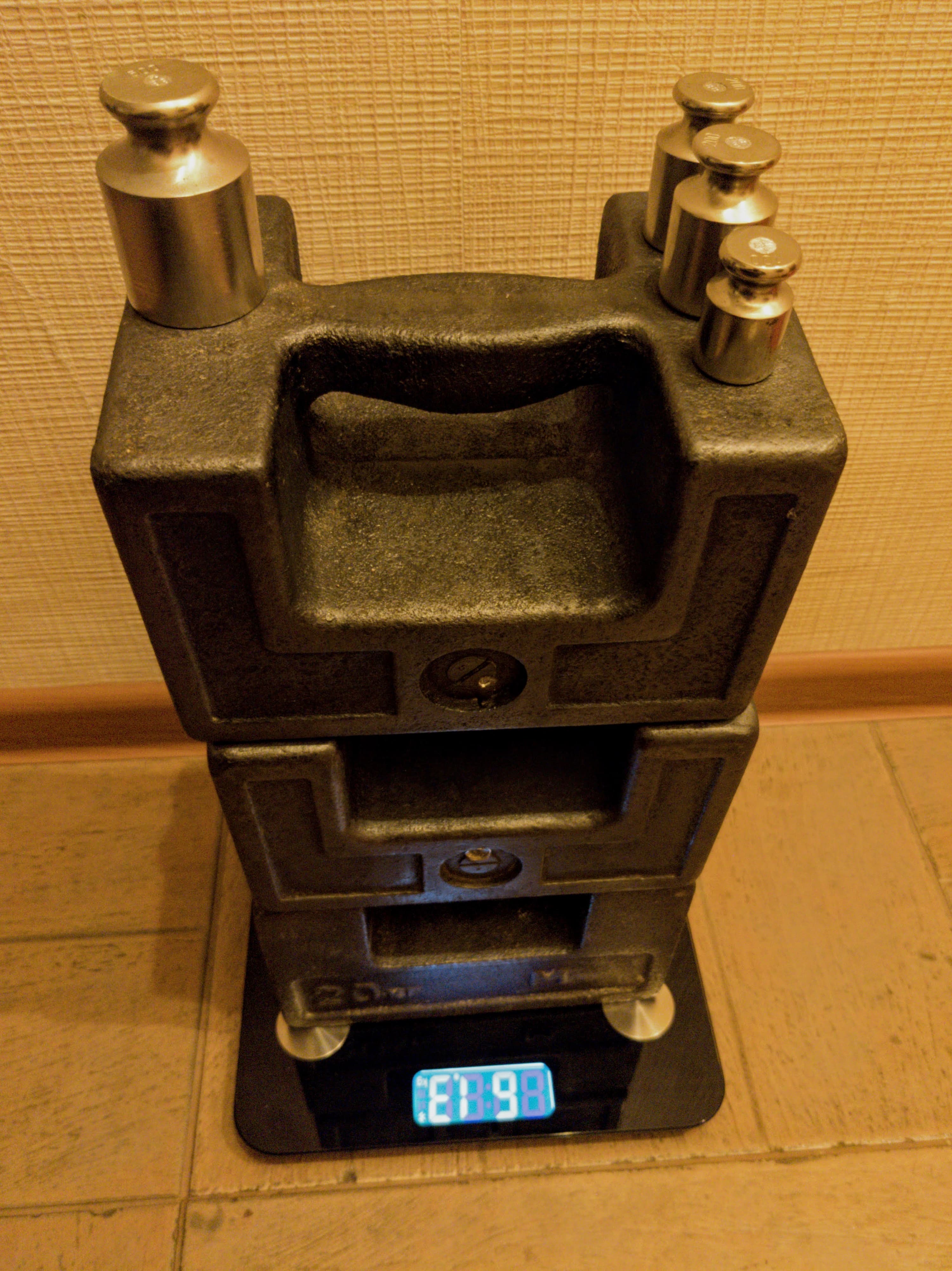 Чтобы оценить правильность показаний, мы воспользовались тремя 20-килограммовыми поверочными гирями класса точности М1 и набором лабораторных разновесов 4-го класса точности массой от 100 до 500 г.
