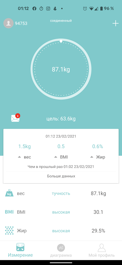 Встав на весы (для всех измерений, кроме веса, необходимо делать это босиком), следует дождаться, пока индикатор веса на дисплее прибора закончит мигать, а приложение издаст звук пришедшего push-уведомления. На главном экране появились результаты измерений с их оценкой.