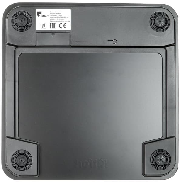 На основании — шильдик с названием модели, серийным номером и краткими техническими характеристиками (тип и количество элементов питания, а также максимальный вес, на который рассчитано устройство).