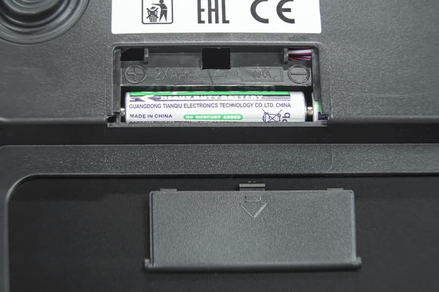 Рядом с наклейкой расположен отсек для элементов питания. Весы работают от двух батареек формата ААА, которые уже установлены при поставке. Чтобы элементы не расходовались в процессе хранения и транспортировки, между ними и контактами отсека вложена изолирующая ленточка.