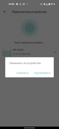 Включенные весы определяются приложением автоматически, но при необходимости можно провести и ручной поиск (забавно, что найденный прибор в приложении называется «переплетное устройство» — гримасы машинного перевода).