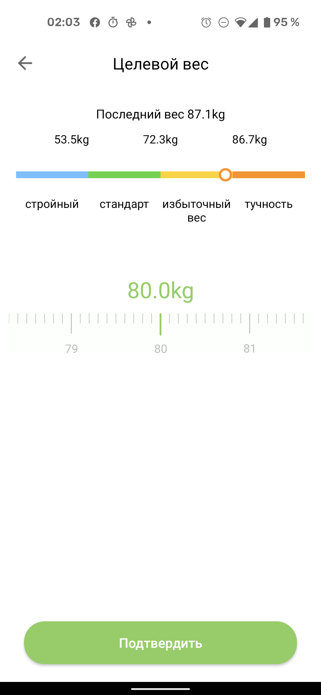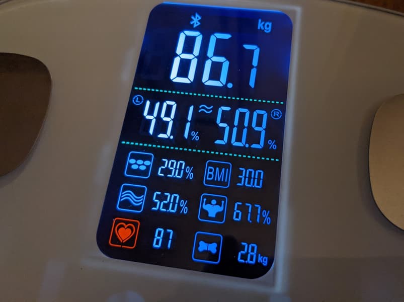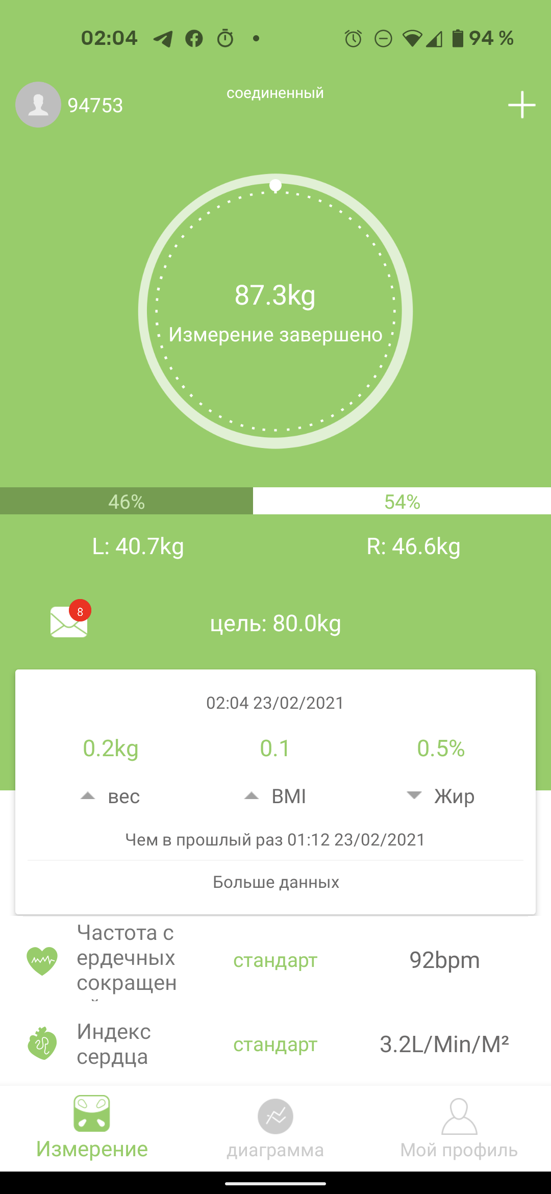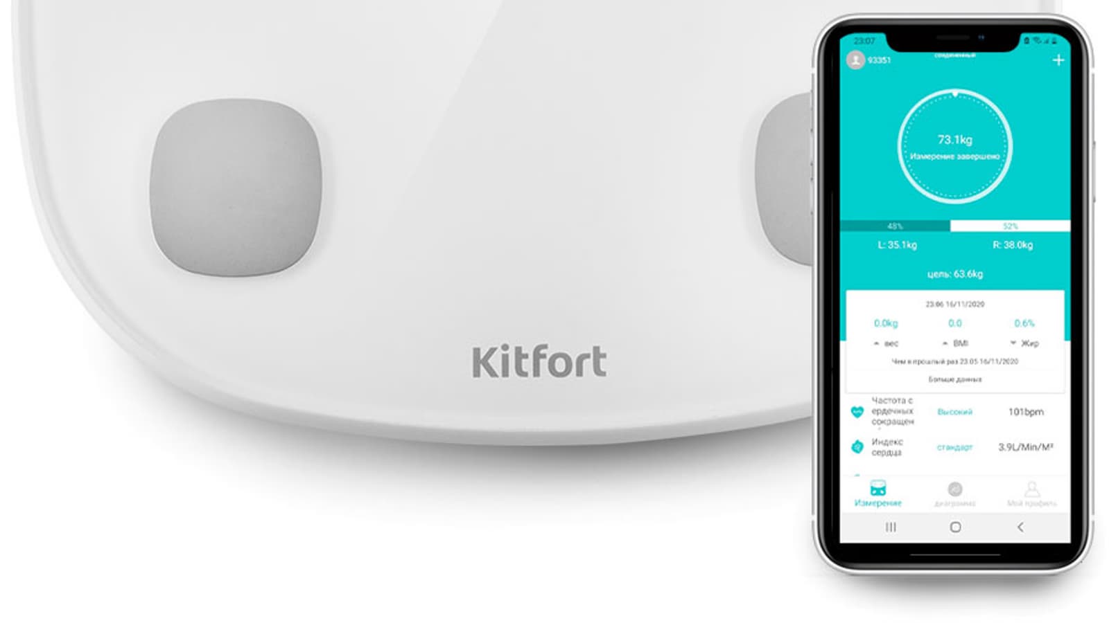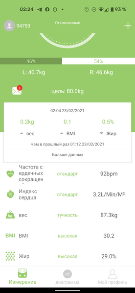 В верхней части экрана отображаются измеренный вес и баланс между левой и правой ступнями. Чуть ниже — основные показатели: вес, индекс массы тела и процент жира.