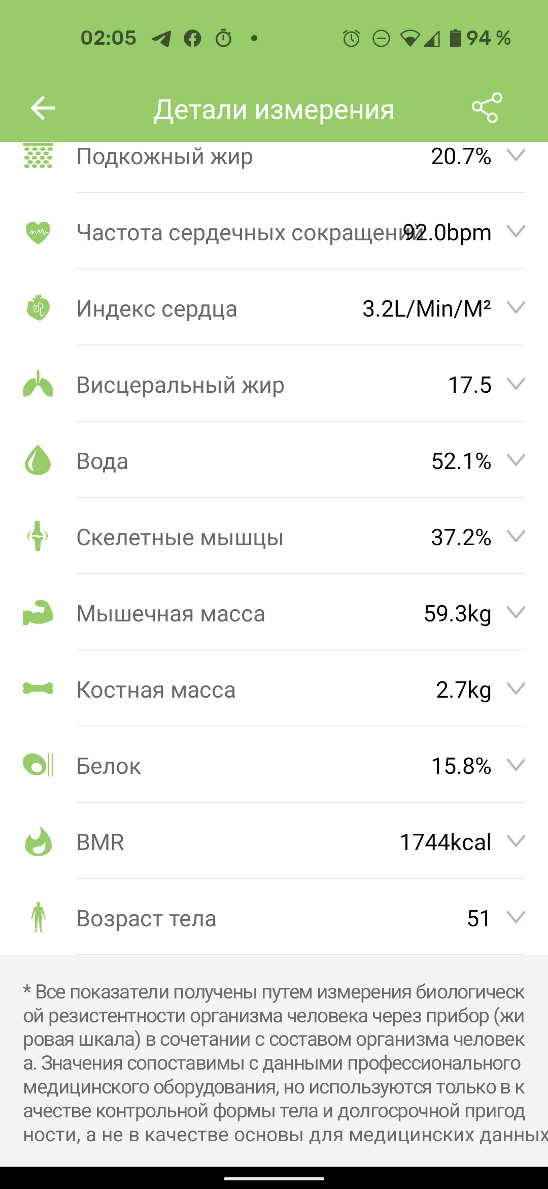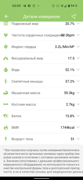 Нажатием на ссылку «Больше данных» открывается страница с полными результатами измерений: помимо перечисленных данных, доступны вес тела без жира, количество подкожного и висцерального жира, содержание воды в теле, процент скелетных мышц, мышечная и костная масса, процентное содержание белка, рекомендуемое суточное потребление калорий и «возраст тела» (мы не знаем, как он вычисляется).