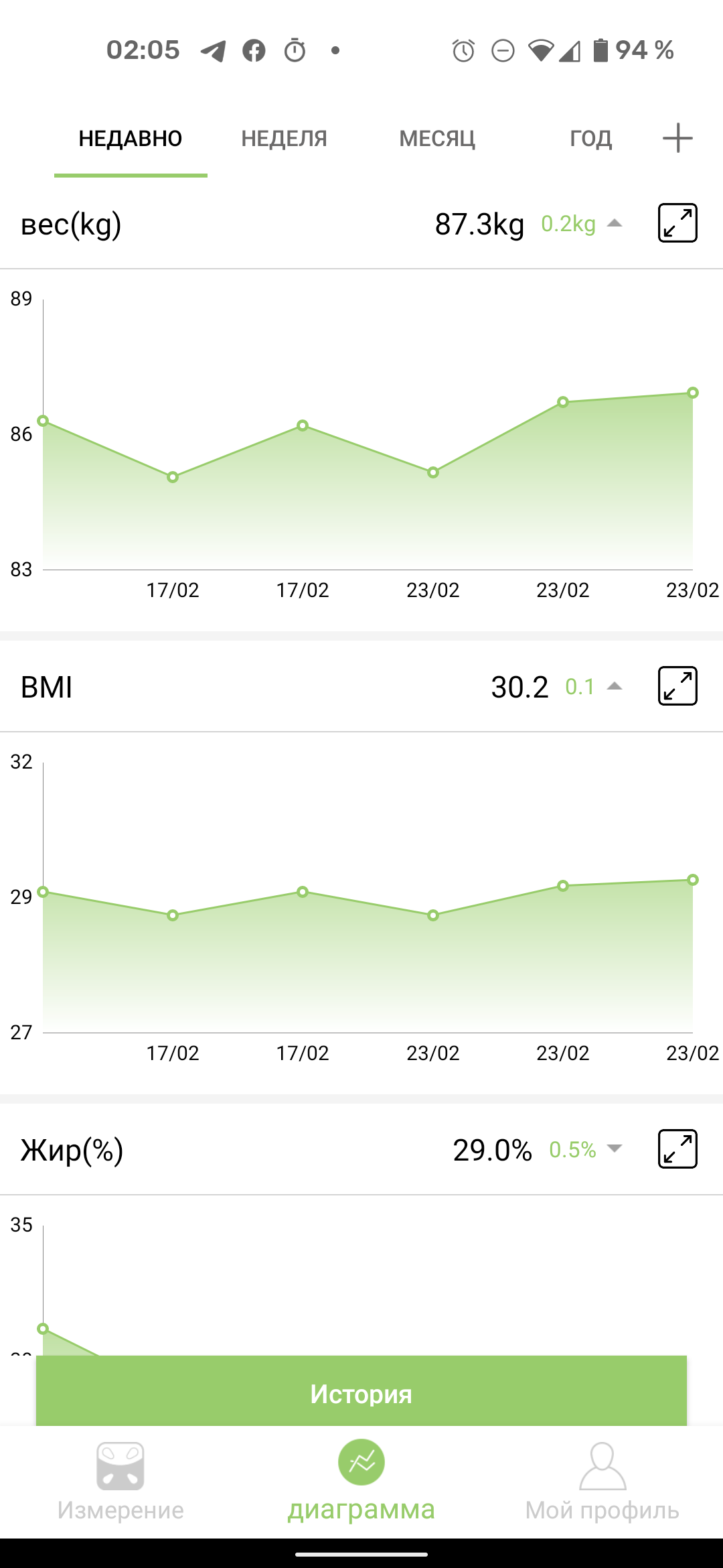 На странице «Диаграмма» в виде графиков видна история результатов измерений и вычислений: доступны данные за последние несколько дней, неделю, месяц и год.