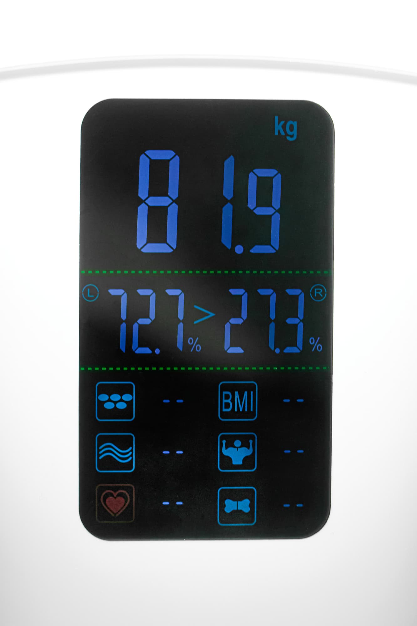 Самые крупные цифры в верхней части отображают вес пользователя. Эти данные появляются на дисплее почти сразу же после начала измерений. Через несколько секунд загорается следующая строка: на ней видно распределение баланса тела между правой и левой ногой: если нагрузка на датчиках неравномерна, результаты могут быть неточны.