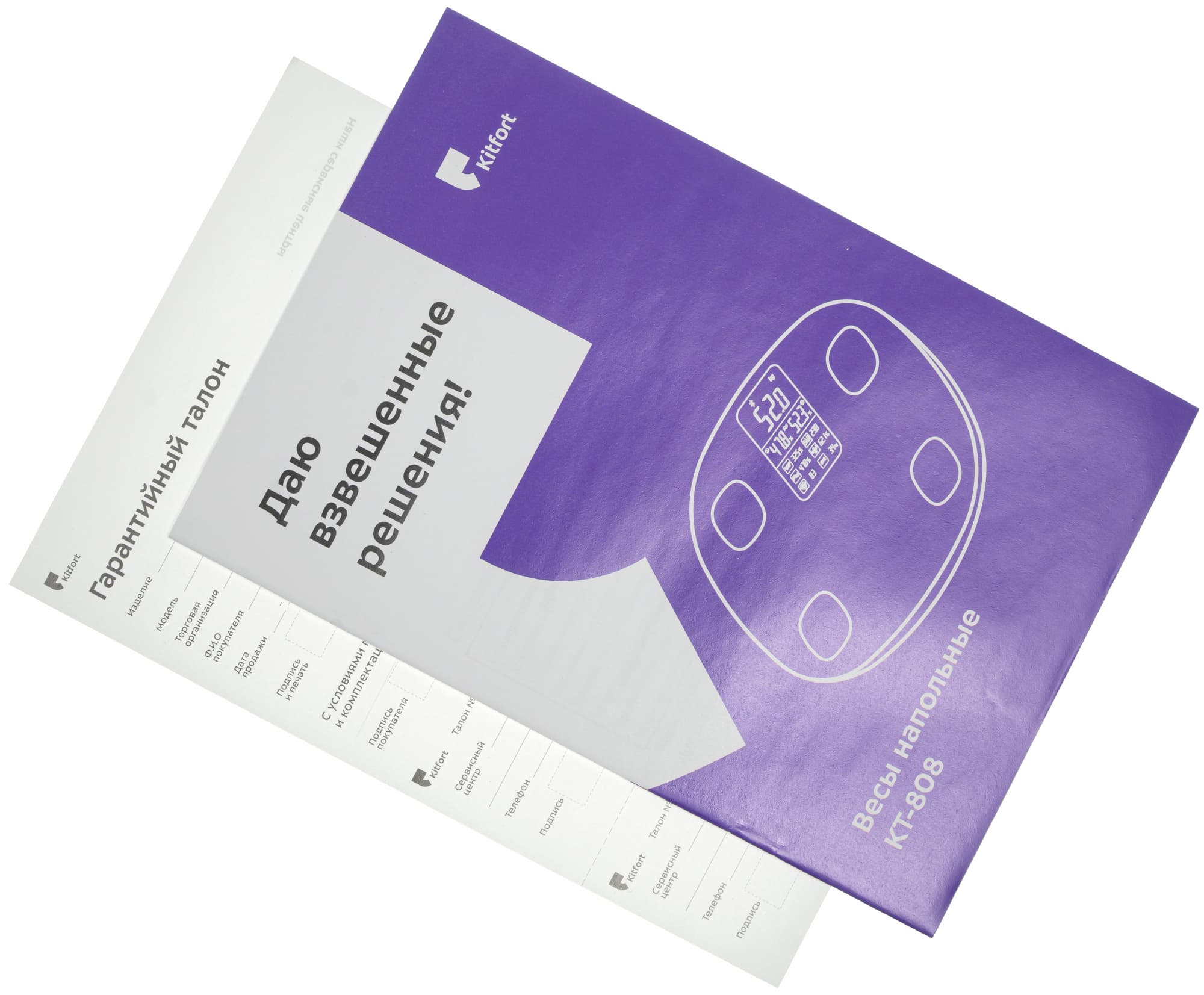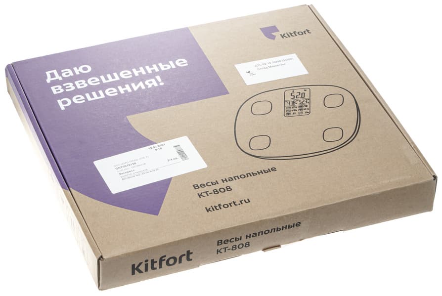 При покупке весы находятся в плоской коробке характерного для компании Kitfort дизайна: крафтовый картон, фиолетовый дополнительный цвет. Лицевая сторона также составлена по неизменной схеме: схематический рисунок устройства, логотип производителя, название модели и фирменный слоган для соответствующей группы бытовой техники. Для напольных весов это «Даю взвешенные решения».